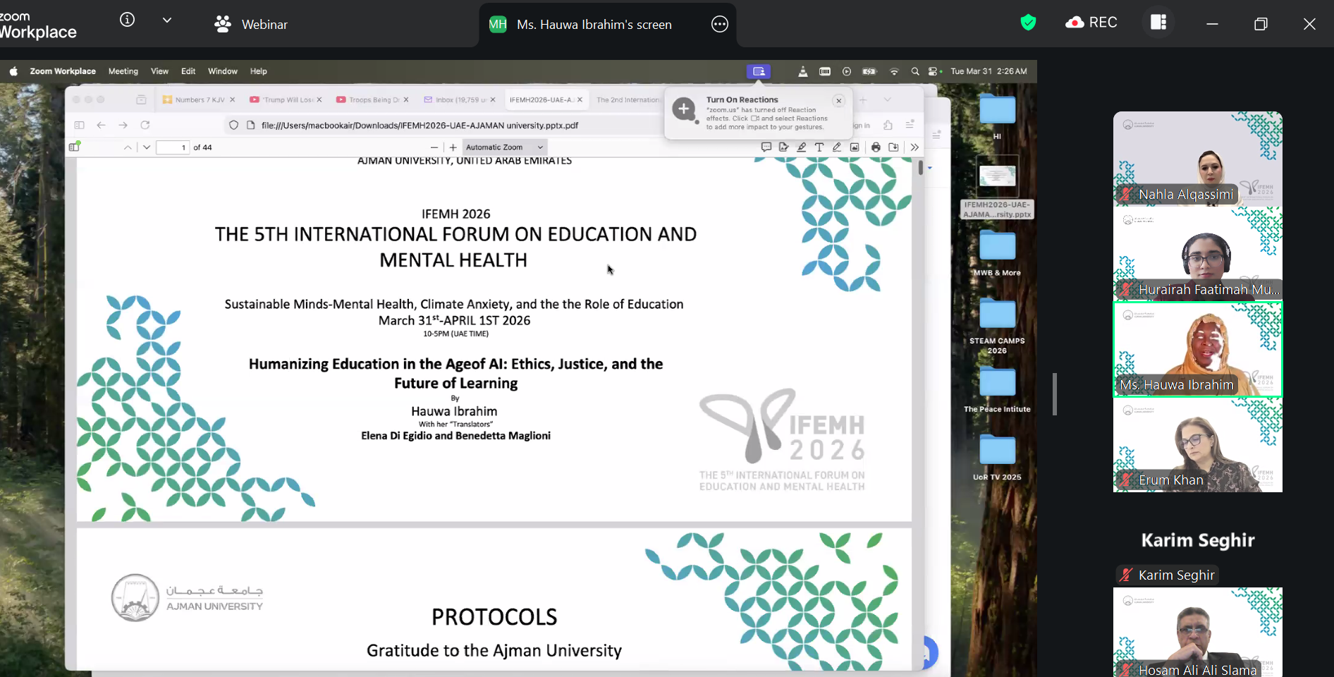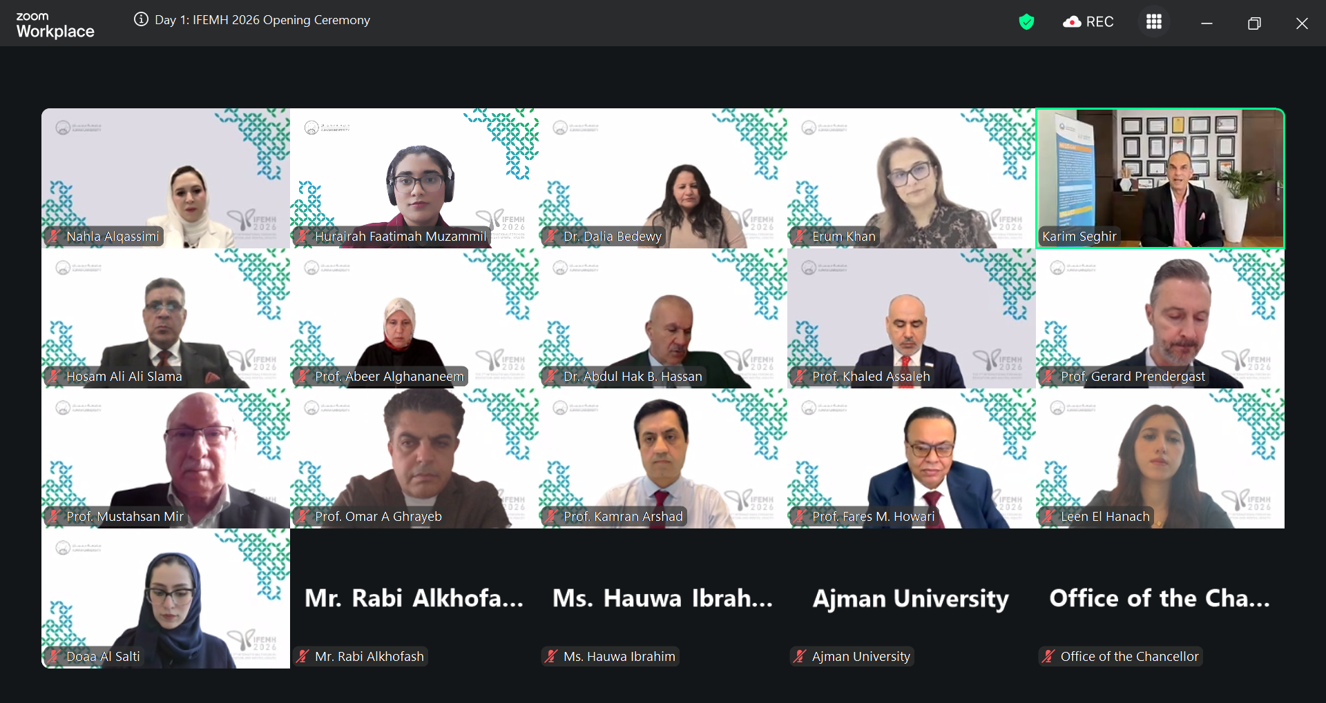 On March 31 and April 1, 2026, Ajman University hosted the 5th International Forum on Education and Mental Health (IFEMH 2026) online via Zoom. Organized by the Counseling and Student Success Center under the leadership of Dr. Nahla Al Qassimi, the forum brought together distinguished guests including the Chancellor, Dr. Karim Seghir, and Dr. Khaled Assaleh, Vice Chancellor for Academic Affairs, along with faculty members.