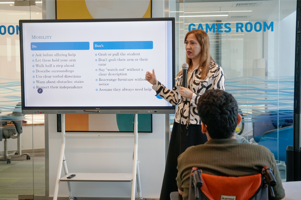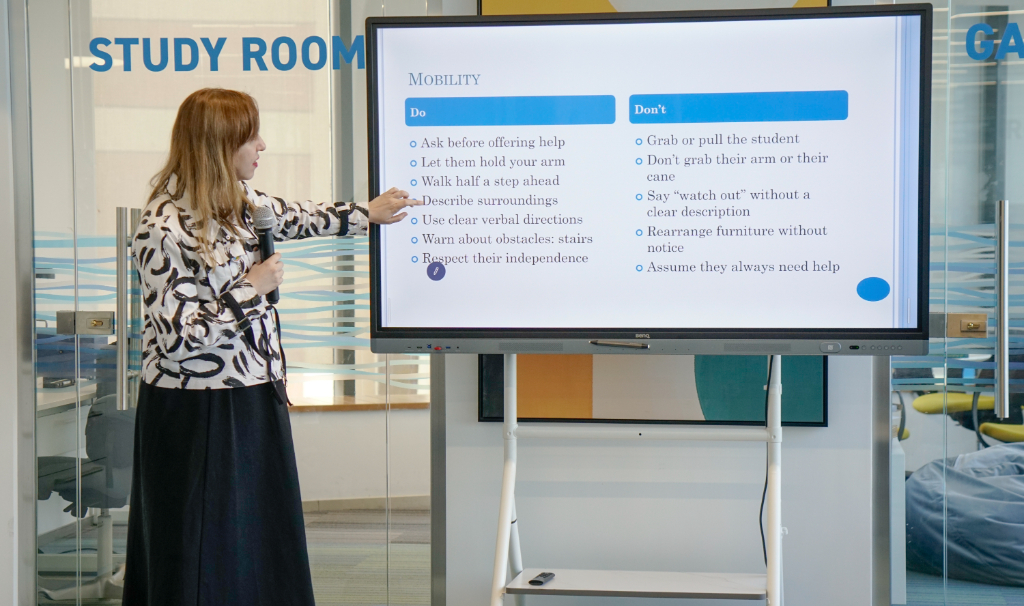 The Deanship of Student Services, through the Center for Inclusive Learning and in collaboration with the Student Success Center, organized an awareness session titled: “Learning Without Limits: Empowering Peer Tutors for Diverse Abilities” on January 26, 2026, focused on visual and autism disabilities. Delivered by Samah Abusniemah, psychological counsellor, the session highlighted challenges faced by students, best practices for support, and strategies to foster inclusive, accessible, and empathetic learning environments. This initiative reaffirmed the university’s commitment to inclusivity, accessibility, and empowering students across campus.