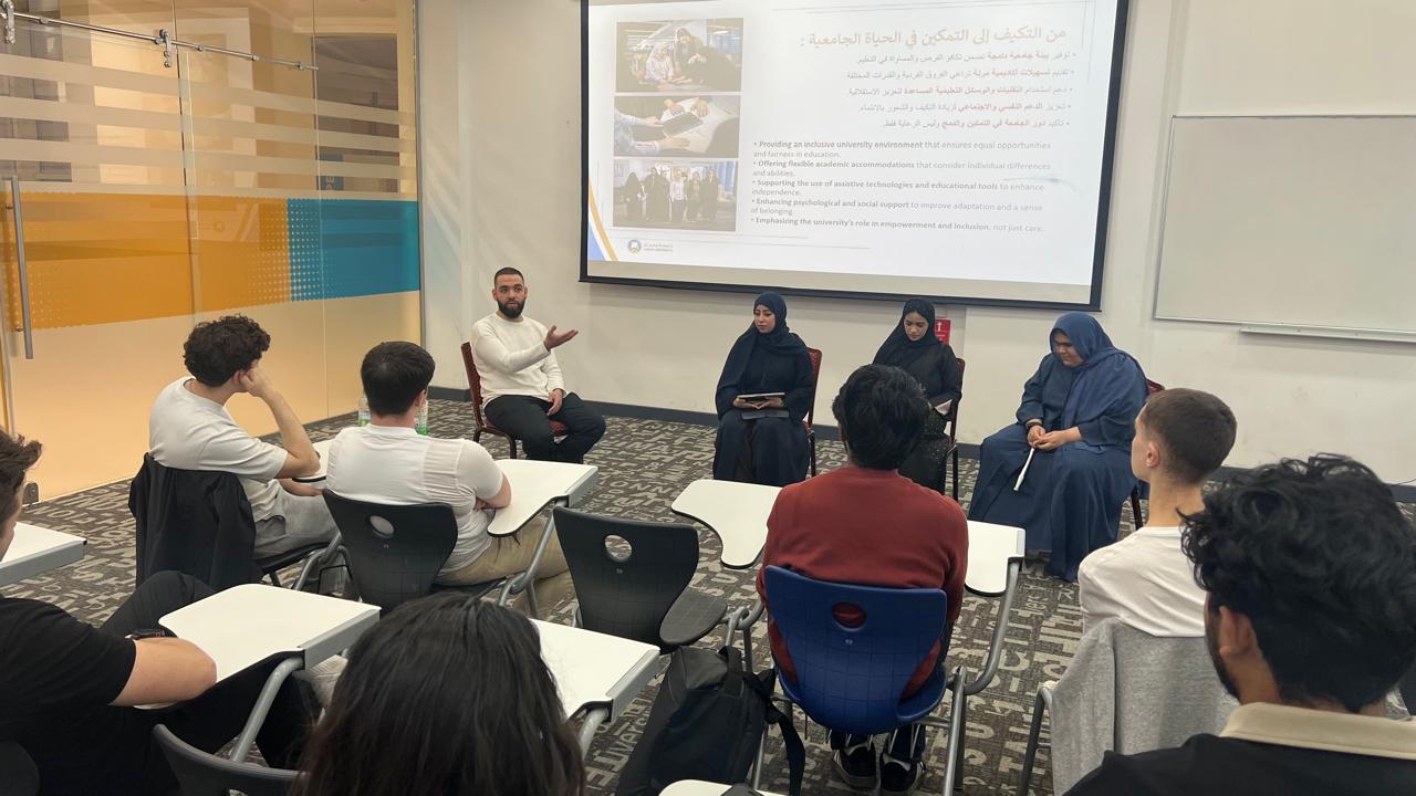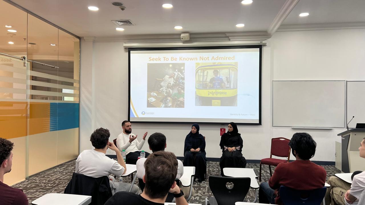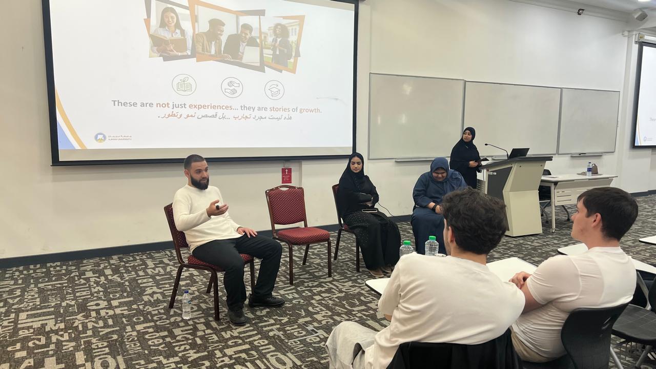 The group meeting featured student speakers Mariam Mohamed Alshamsi and Mouza Ali AlMandoos from the College of Humanities and Sciences, along with Wael Mohamad Alhalabi from the College of Engineering and IT. The interactive discussion provided a platform for students to share their academic journeys and personal experiences at Ajman University, offering new students valuable insights into campus life, cultural diversity, and student engagement. Attendees benefited from open dialogue and peer perspectives that supported a smooth transition into university life.