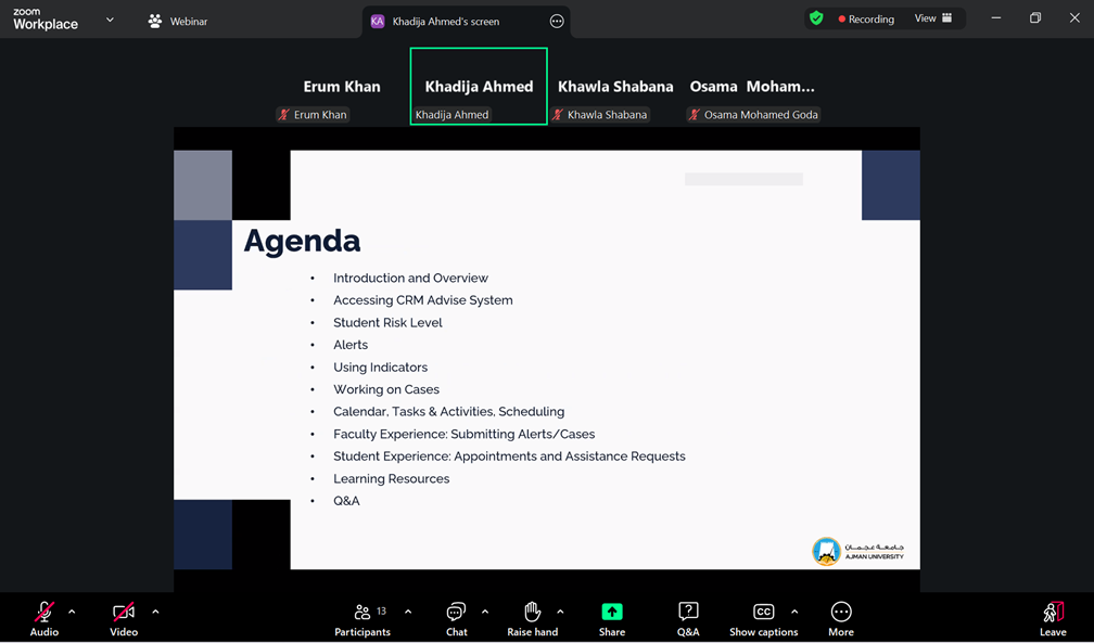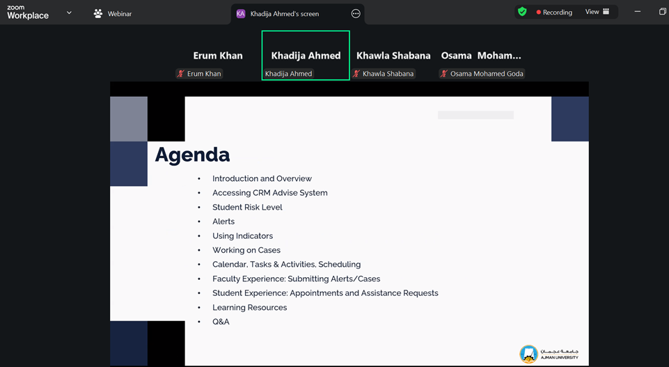 On February 17, 2026, the Student Success Center (SSC), in collaboration with the IT Department, hosted a webinar on CRM Advise by Ellucian. The session covered key features such as Risk Level, Course Score, and Success Score, demonstrating how predictive analytics can help identify at-risk students early. This initiative reinforces the University’s commitment to data-driven decision-making and proactive academic support to enhance student retention and success.