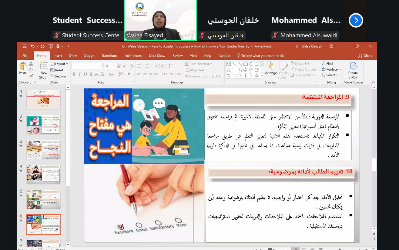 On Tuesday, February 24, 2026, the Student Success Center, in collaboration with the College of Humanities and Sciences – Sociology Department, hosted a webinar titled “Academic Excellence: How to Improve Your Academic Performance and Reflect on Your Results.”