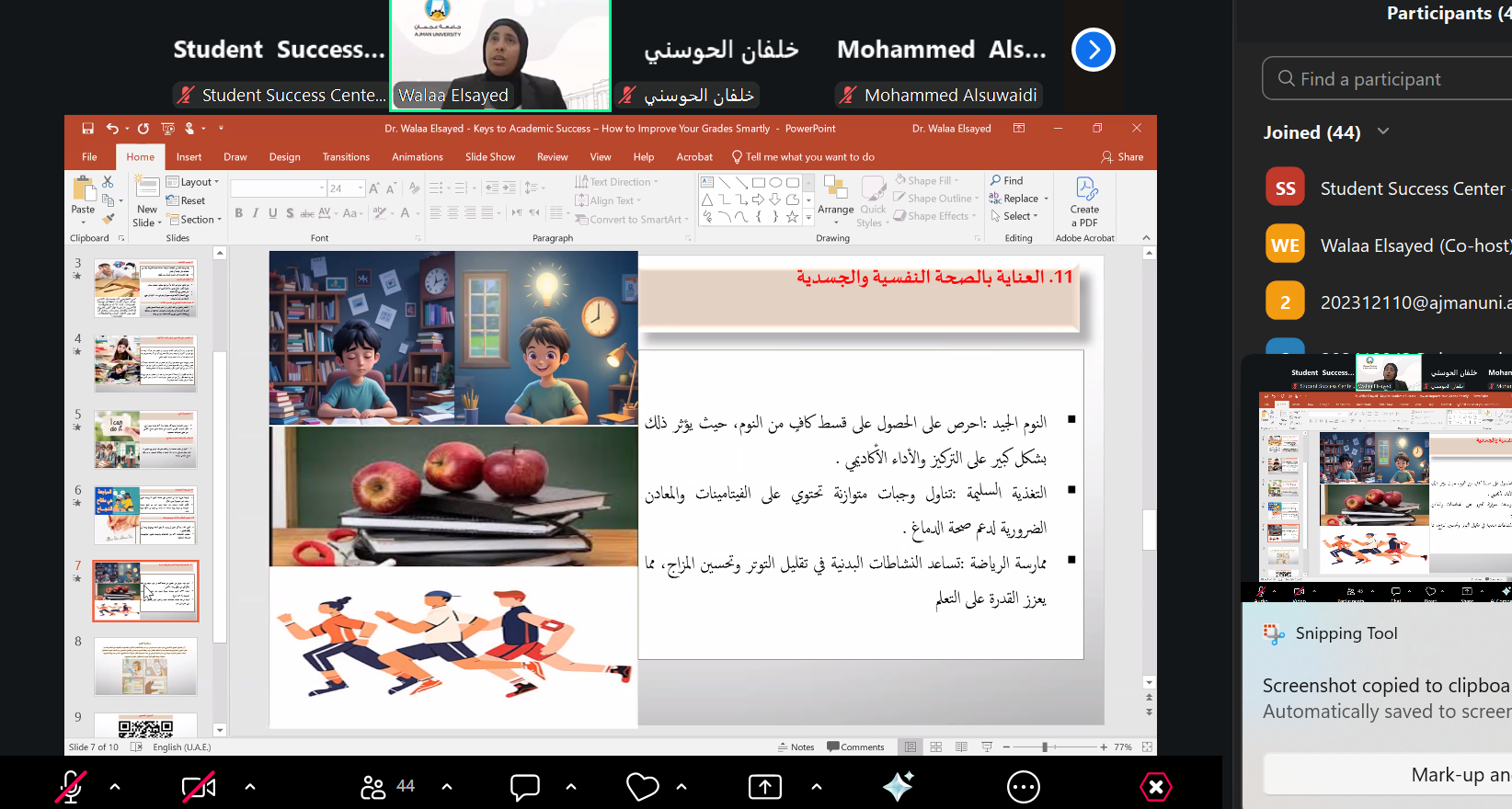 The session was presented by Dr. Walaa Elsayed, Associate Professor, College of Humanities and Sciences, and focused on helping students enhance their academic performance through practical strategies and reflective learning approaches. Participants gained valuable insights into effective study habits, methods for evaluating their academic results, and actionable steps to support continuous improvement.