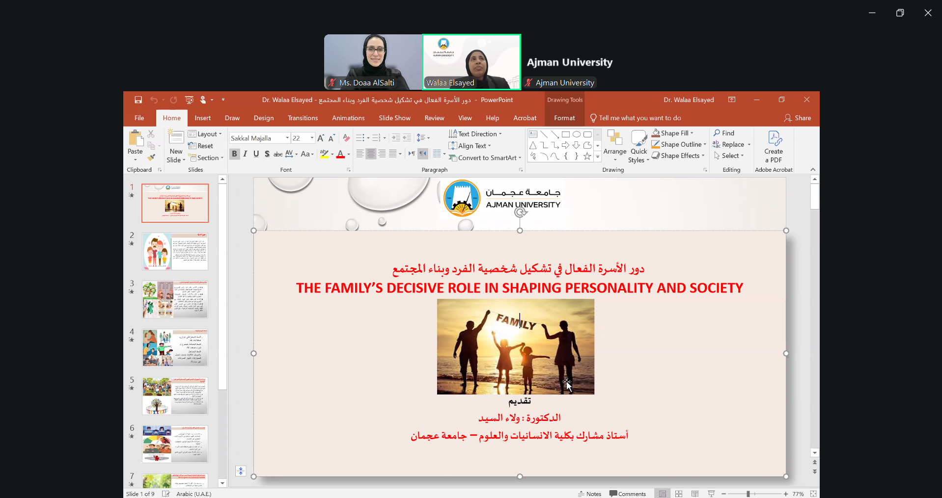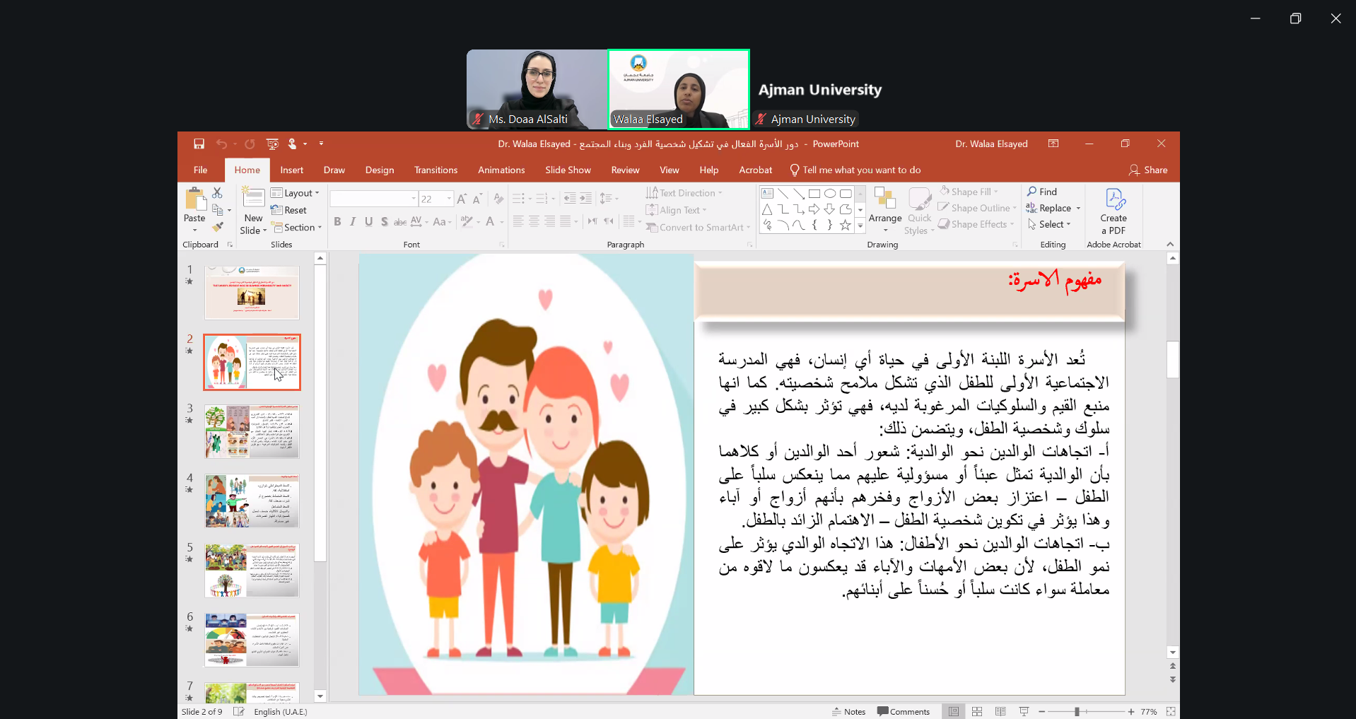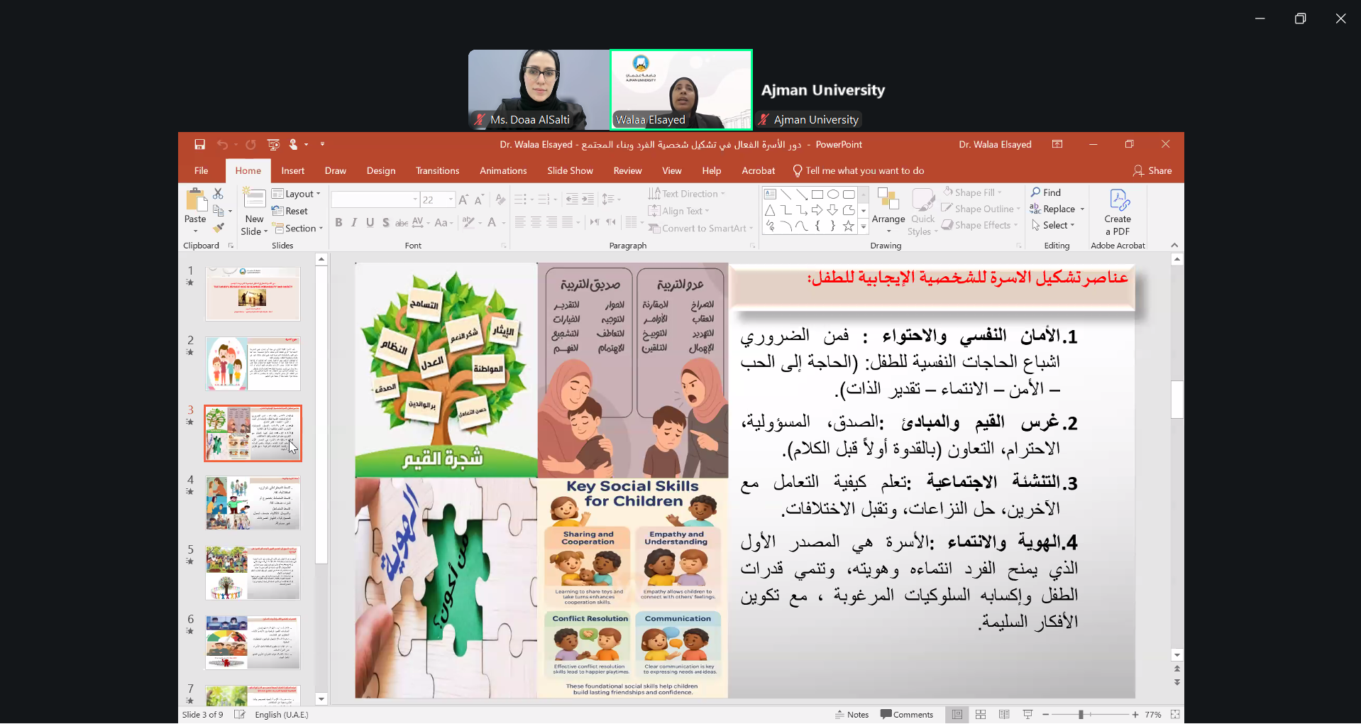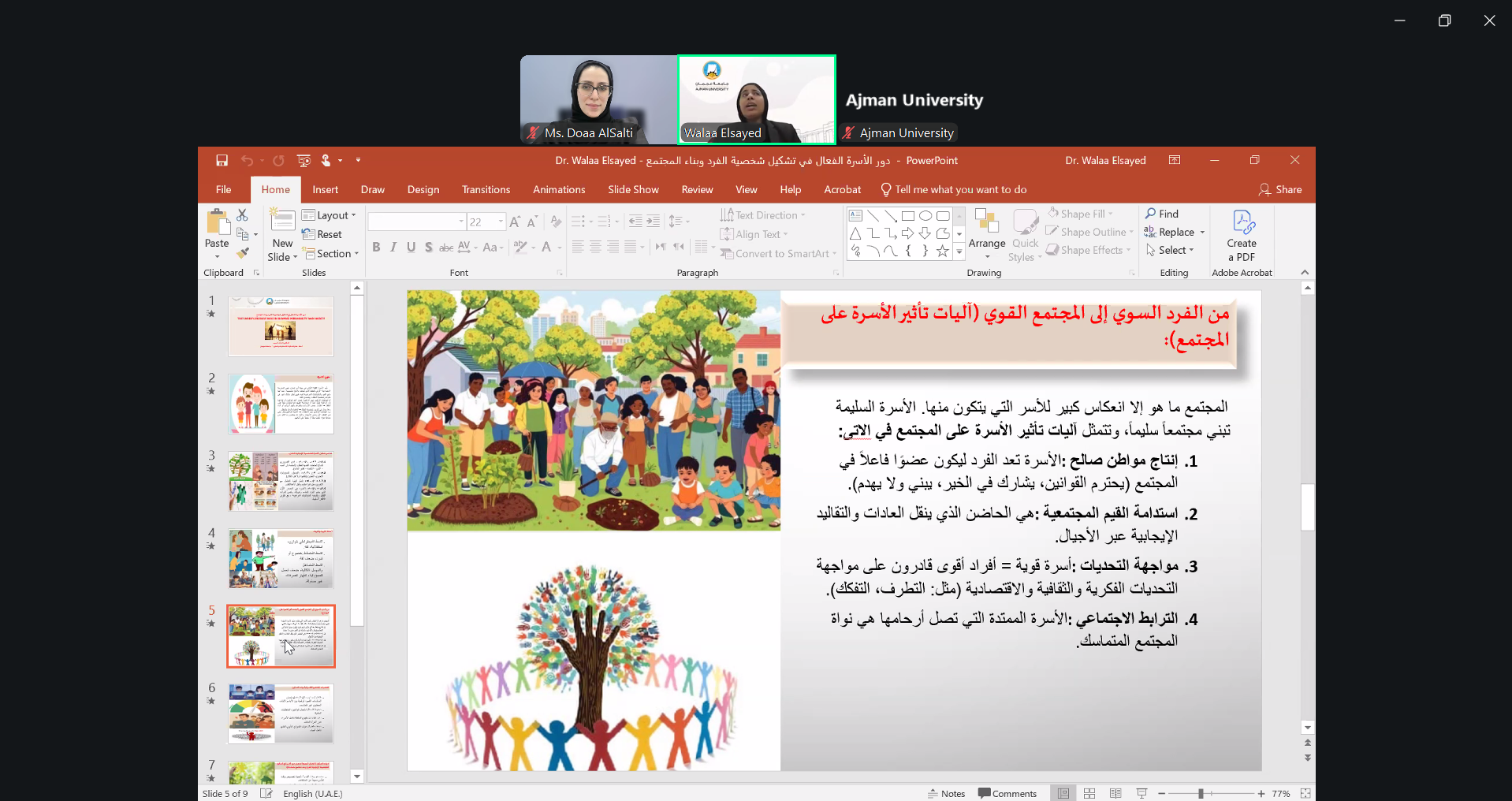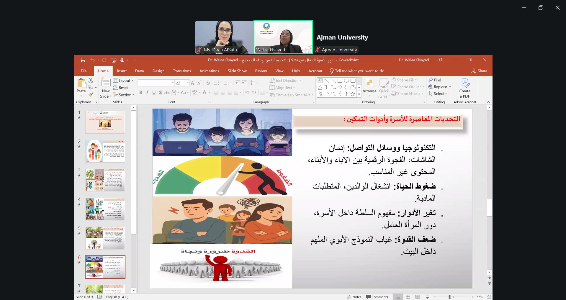 On February 25, 2026, Dr. Walaa Elsayed, Associate Professor at the College of Humanities and Sciences, led a session on the important role of family in shaping personality and society. Participants discussed how family guidance, values, and communication influence personal growth, social skills, and positive contributions to the community.