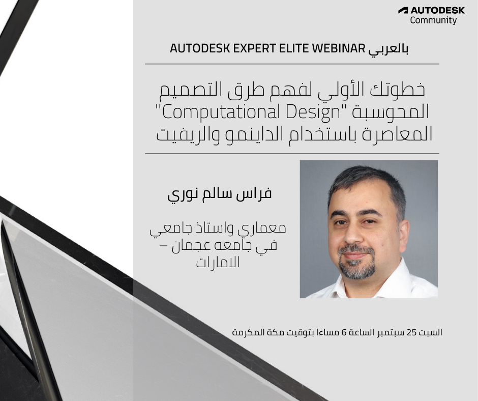 Event Title: Autodesk Expert Elite Webinar - Your first step to understanding the path of computerized design (computational design) by Mr. Fira Registration Link: https://bit.ly/3nLx2Gu |