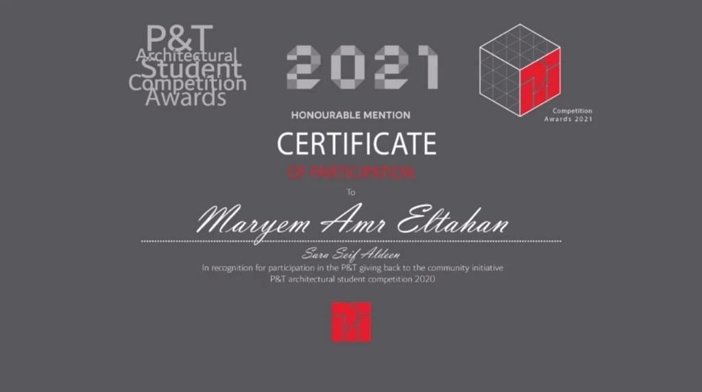 Sara Seif Aldeen and Maryem Altahan, students from the College of Architecture Art and Design at Ajman University, were nominated as one of the best 10 projects out of 120 projects in P&T Architectural Student Competition Awards, and they were given Honourable certificates.