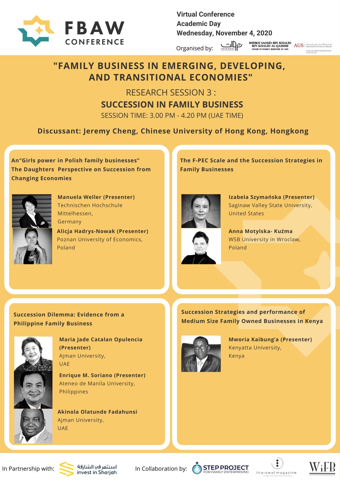 Dr Maria Opulencia of the Department of Management and Acting Dean Akinola Fadahunsi recently presented a paper in collaboration with Prof. Enrique Soriano, a World Bank Consultant on Family Business in Asia during the Family Business in the Arab World Conference hosted virtually by American University of Sharjah on November 4-5, 2020. The conference was attended by 390 scholars, business owners and experts from 50 different countries.