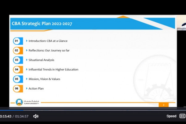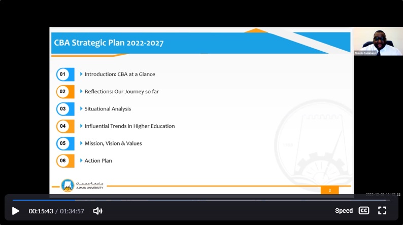 The CBA Strategic Advisory Board held its AY2022-2023 fall meeting via zoom on Thursday, December 8th, 2022. In attendance were Dr. Narimane Hadj Hamou, Founder & CEO of CLICKS (Center for Learning Innovations & Customized Knowledge Solutions ), Prof. Dipak Jain, President (European) of the China-Europe International Business School,  Mr. Ahmed Abuljobain, COO Nobles Holding, Virginia, USA, Dr. Chuloh Jung, Director of Ajman University Innovation Center, Dr. Vasilli Joannidès de Lautor, Director of the DBA Program at Grenoble Ècole de Management, Dr. Eda Çalişkan, Senior Organization & Talent Development Director, GE Middle East, Turkey & Africa, Ms. Karen Saad Zakaria (AU student member) and CBA Dean Prof. Akinola Fadahunsi.