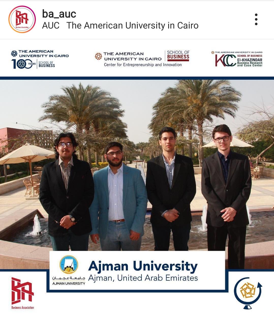 The AUC School of Business, Center for Entrepreneurship and Innovation (CEI), El-Khazindar Business Research and Case Center (KCC) and Business Association (BA), launched the inaugural run of the International Case Competition (ICC) over April 19- 24, 2019. The ICC brought together teams of students from all over the world, to compete in solving a challenging business case. ICC was the first competition of its kind organized in Egypt and focusing on business challenges facing high-growth entrepreneurial ventures. The competition provided students with a unique learning experience to understand the business and entrepreneurship landscape in Egypt, Africa, and the Middle East, including complex issues re consumer behavior, economic trends, regulatory and policy reforms, technology adoption and the supporting ecosystem. This case-solving competition is aimed to blend a cross-cultural understanding of working with Egyptian students and entrepreneurs with a grasp of the Egyptian culture in a well-designed process. Ajman University team included Ali Mansoor, Maksim Kerimov, Mohit Sidhu, and Mustafa Mukadam with Dr. Anshuman Sharma from the Department of Marketing as a mentor.