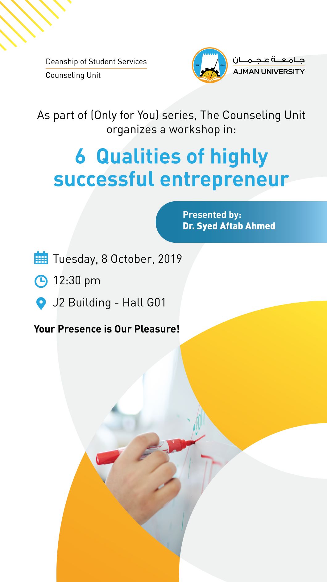 On October 8th, Student Counselling Unit along with CBA -Marketing Department conducted a workshop on “Six Qualities of Highly Successful Entrepreneur”.