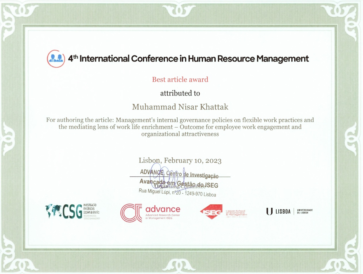Dr Muhammad Nisar Kattak has been awarded the best paper prize for his co-authored paper entitled “Management’s Internal Governance Policies on Flexible Work Practices and the Mediating Lens of Work – Outcome for Employee Work Engagement and Organizational Attractiveness”. Dr Muhammad presented the paper at the 4th International Conference on Human Resource Management 2023 held on February 9th-10th 2023 at the University of Lisbon. Expressing his delight at the news, Dr Muhammad said “It was a moment of great happiness and pride to receive the best paper award in the prestigious Human Resource management Conference. I am grateful to Ajman University for providing the financial support for me to participate in the conference”.