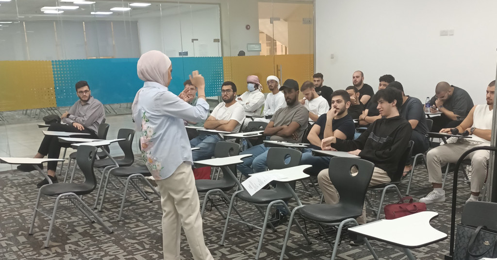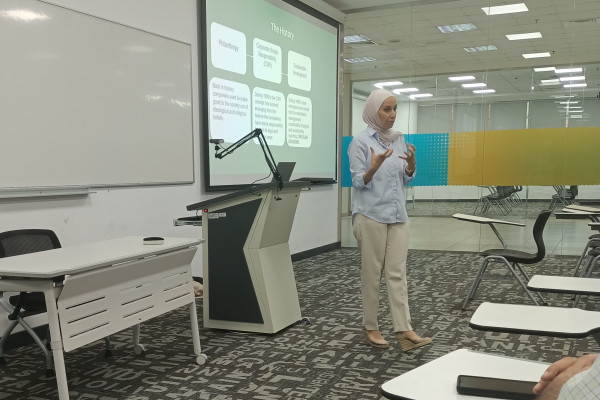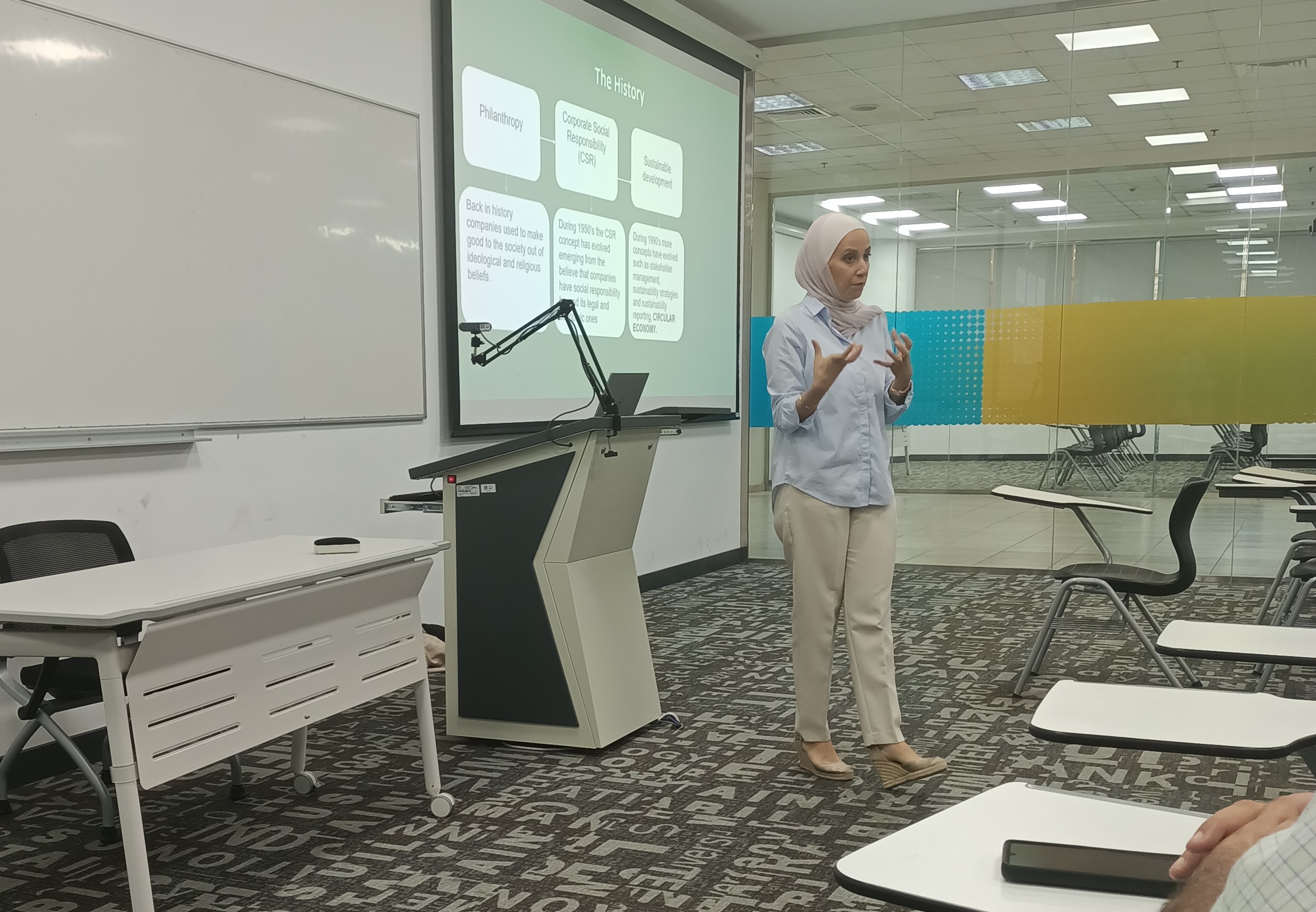 In partnership with INJAZ UAE, the CBA Management department organized a dynamic workshop on sustainability for students. Led by seasoned sustainability professional Ms. Khulood Hindiye, the interactive session covered a wide range of topics on climate change, entrepreneurship opportunities, and the Middle East's performance in waste management. Ms. Hindiye emphasized potential careers in sustainability and shared insights on integrating CSR into private sector strategies. Ms. Hindiye's insights on potential careers in sustainability, coupled with her commitment to volunteerism, enriched the session, aligning with the university's vision for socially responsible business leaders.