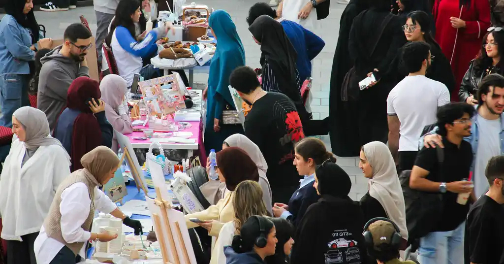 The bazaar featured a variety of student-run businesses offering food, handmade jewellery, henna, crafts, clothing, and other creative products. Inspired by the 1980s, the decade in which Ajman University was founded, the event incorporated a retro theme with bright colours, neon lighting, and projection-mapping displays.