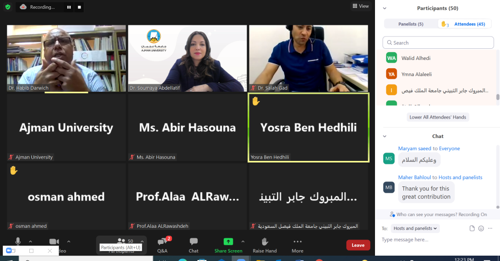 On February 23, 2022, the Humanities and Social Sciences Research Center launched its first inaugural webinar. The webinar was conducted by Dr. Habib Al-Darwish, an associate professor at King Abdulaziz University in Saudi Arabia and moderated by Dr. Soumaya Abdellatif, an assistant professor at Ajman University. The webinar was titled “Qualitative Research Methods and their Importance in Contemporary Sociology”, which was distinguished by an immense audience of more than 65 participants and a great interaction on the part of the participants, among them were PhD students at King Abdulaziz University and Professors from and outside Ajman University. In the webinar, Dr. Al-Darwish touched upon the question of the approach in sociology between the positivist paradigm and the hermeneutic paradigm and the general intellectual framework that accompanied the talk about the need to reconsider the interpretive paradigm in contemporary sociological research. Then he presented the obstacles involved in using the qualitative approach in Arab sociological studies.