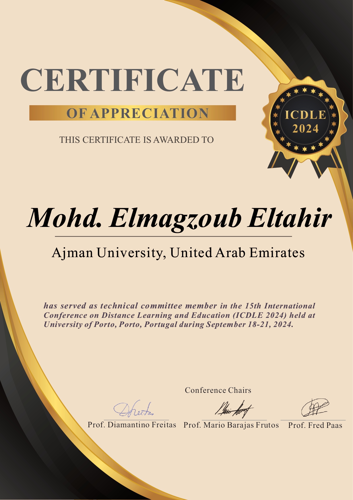 The College of Humanities and Sciences is proud to announce that Dr. Mohamed Eltahir has been awarded Best Presentation at the 15th International Conference on Distance Learning and Education (ICDLE 2024). The prestigious conference, held at the University of Porto in Portugal from September 18-21, 2024, brings together global experts in education and technology.