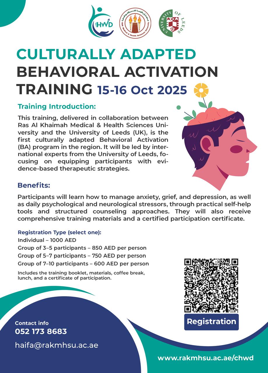 As part of the Psychology Program’s commitment to providing students with valuable experiential learning opportunities, Dr. Rasha, Head of the Psychology Department, led a group of 15 psychology students from Ajman University to attend the Culturally Adapted Behavioral Activation (BA) Training held at Ras Al Khaimah Medical and Health Sciences University (RAKMHSU) on October 15–16, 2025.