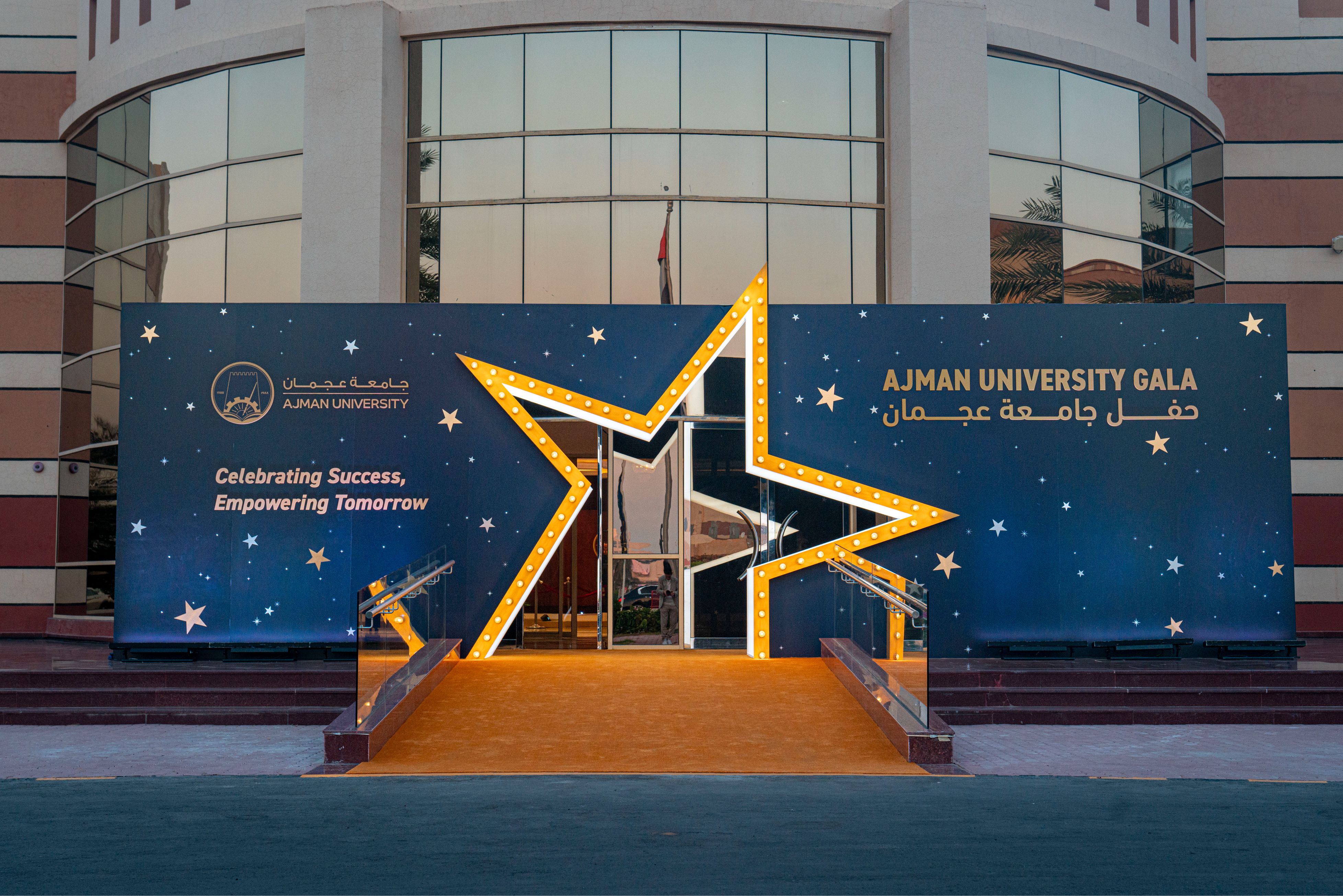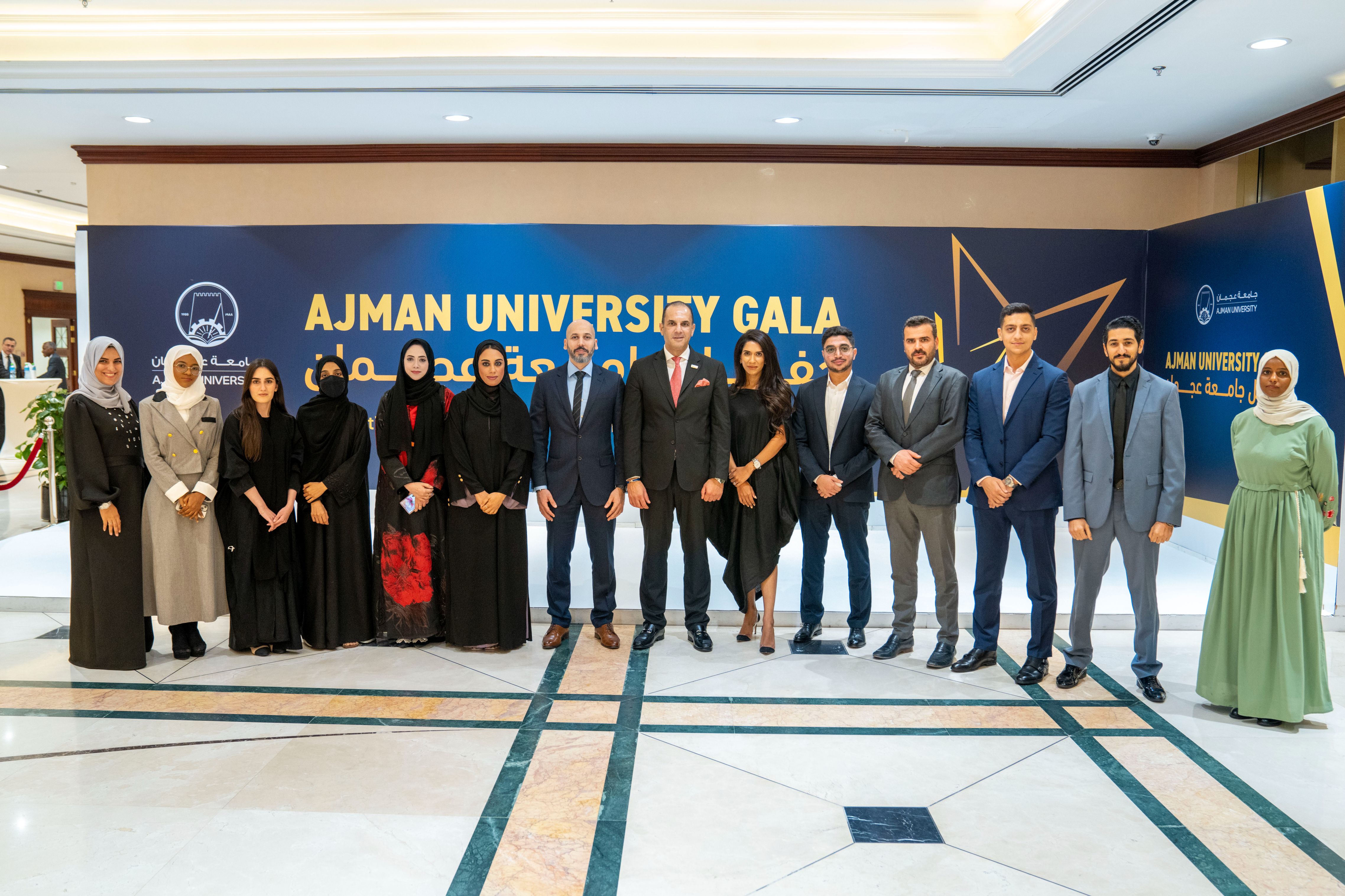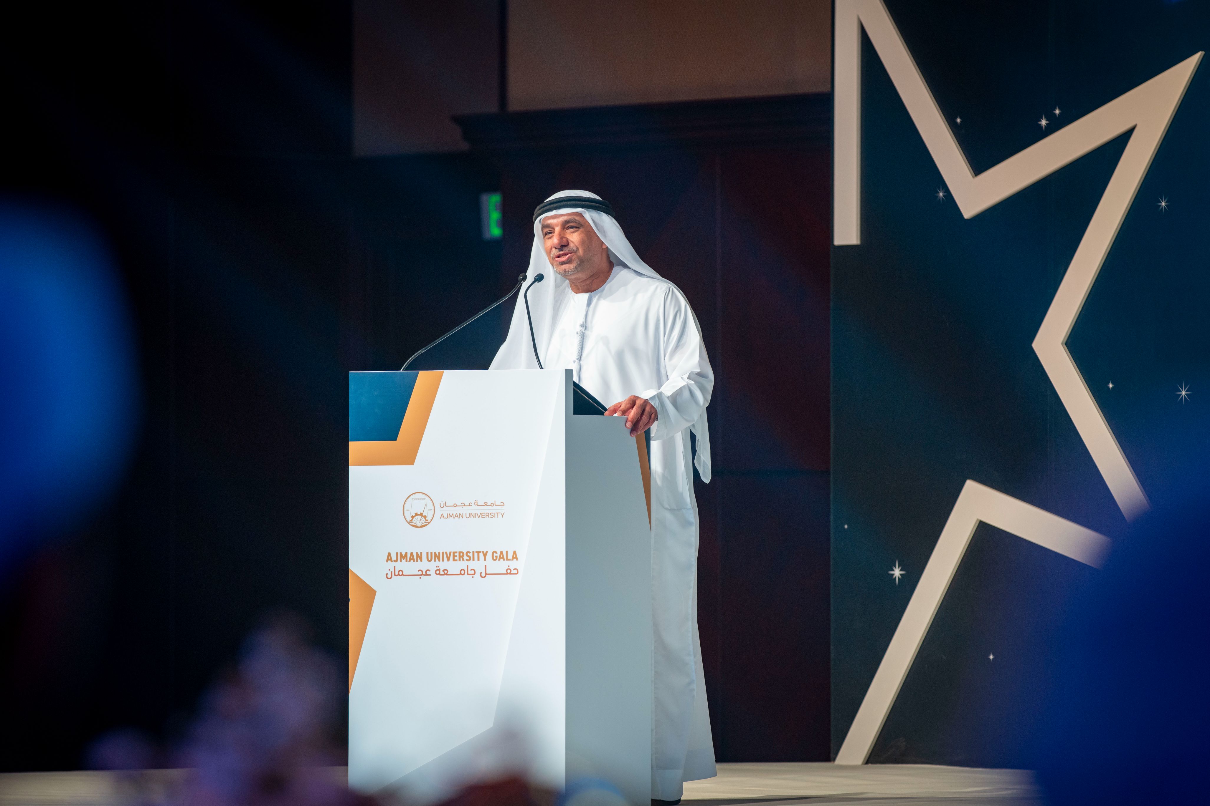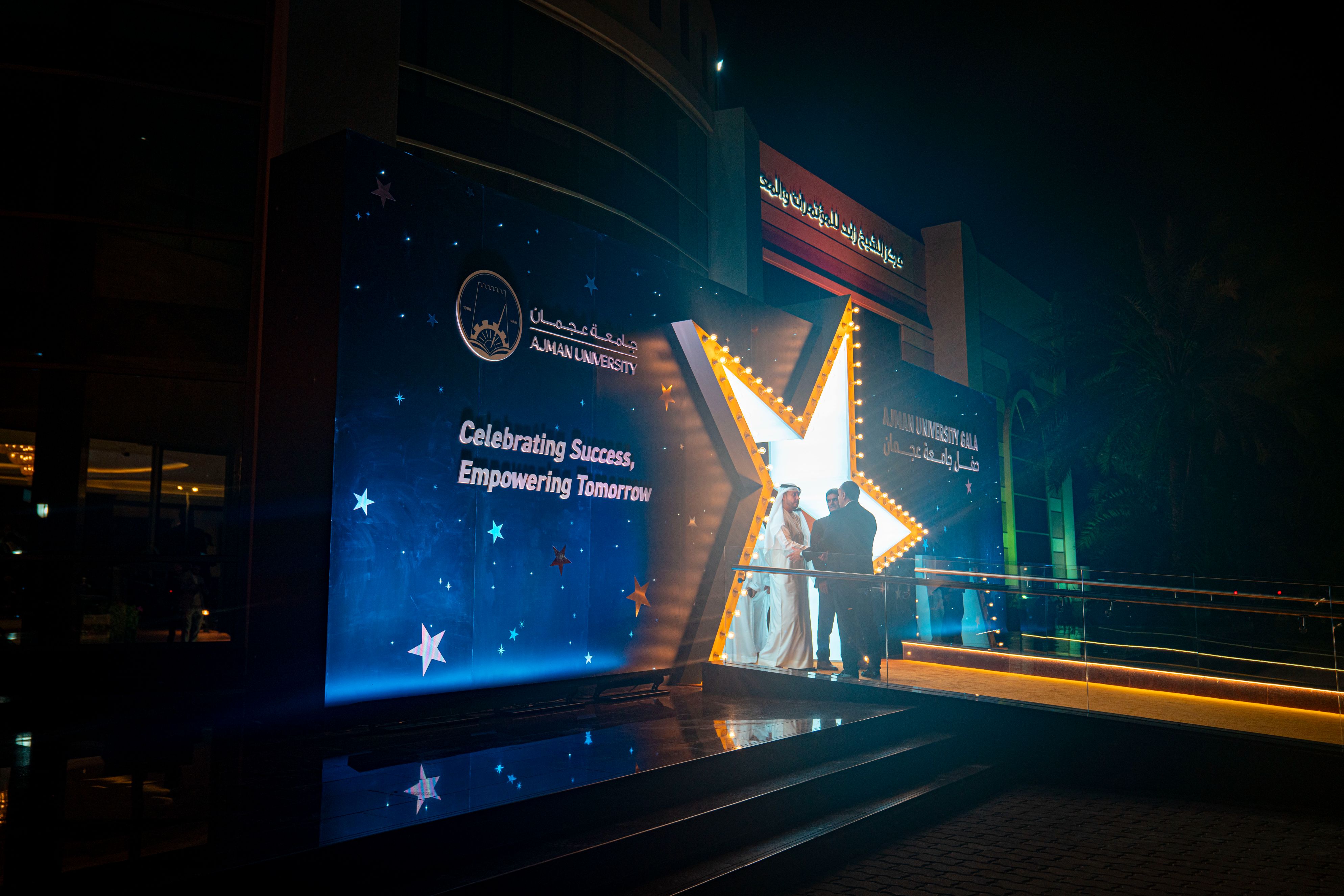 Under the esteemed patronage of His Highness Sheikh Ammar bin Humaid Al Nuaimi, Crown Prince of Ajman, Chairman of the Executive Council, and Chairman of the Board of Trustees of Ajman University, Sheikh Rashid bin Humaid Al Nuaimi, Chairman of Ajman Municipality and Planning Department and Vice Chairman of Ajman University's Board of Trustees, attended Ajman University Gala celebrating the University's recent local and international achievements.