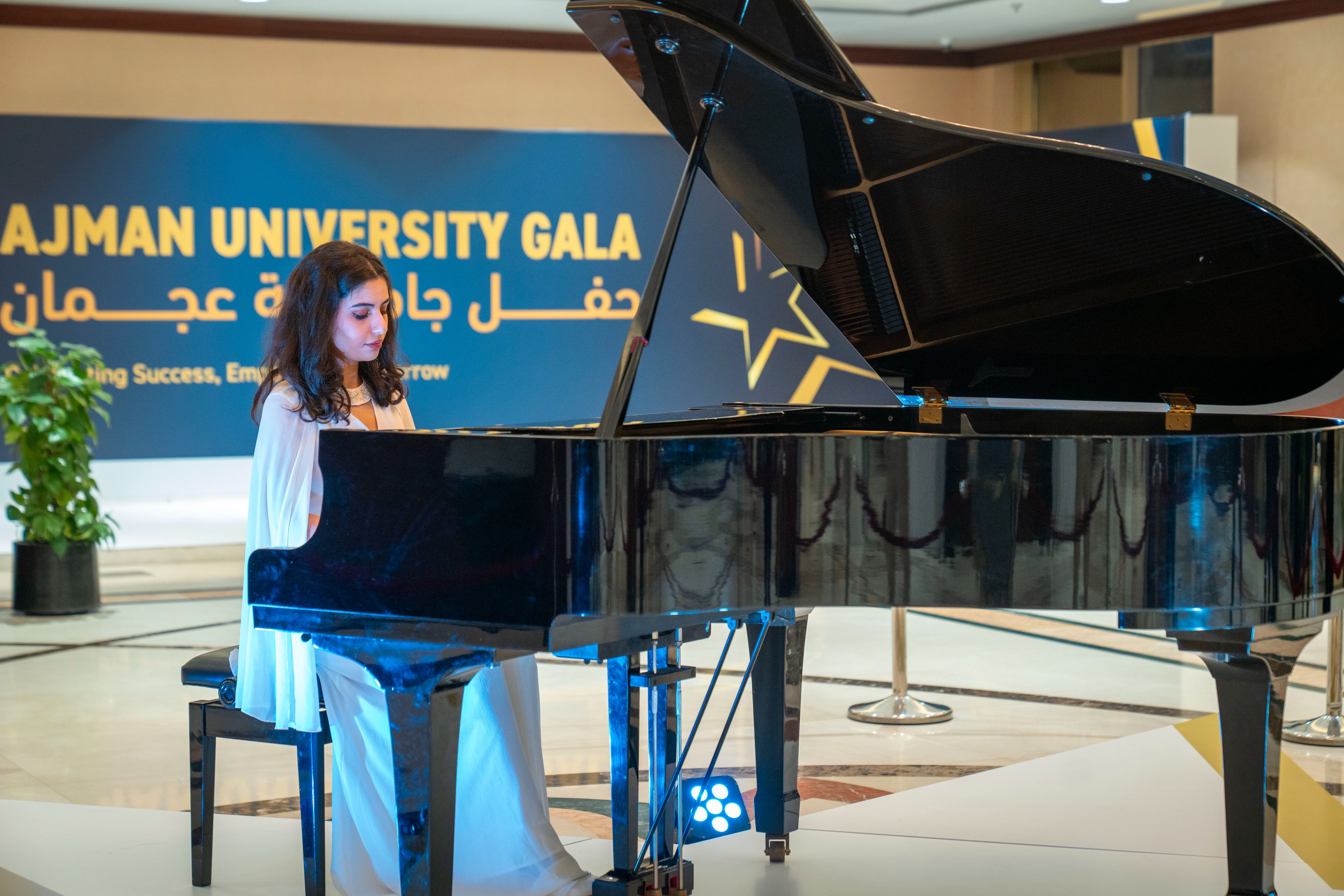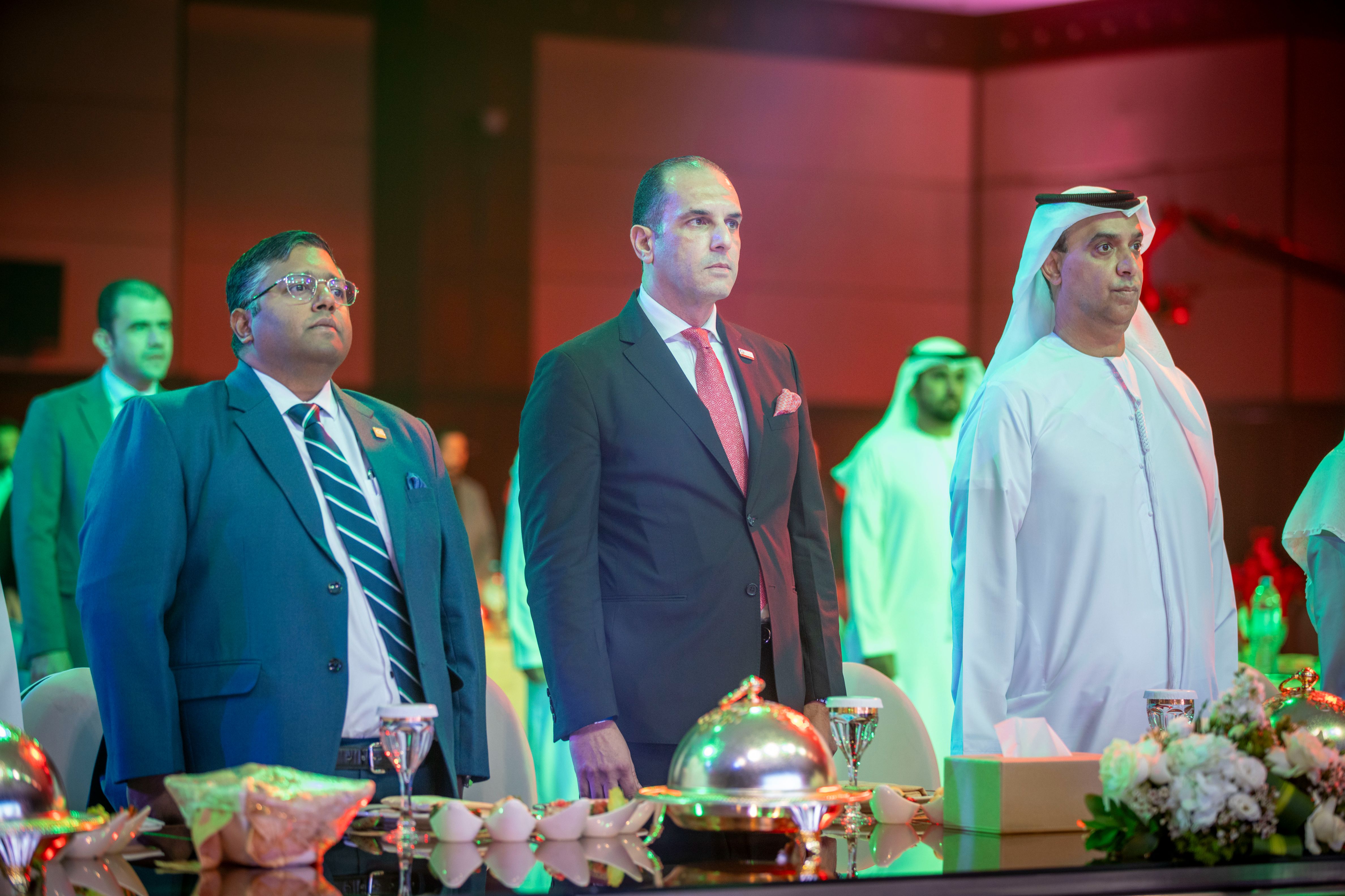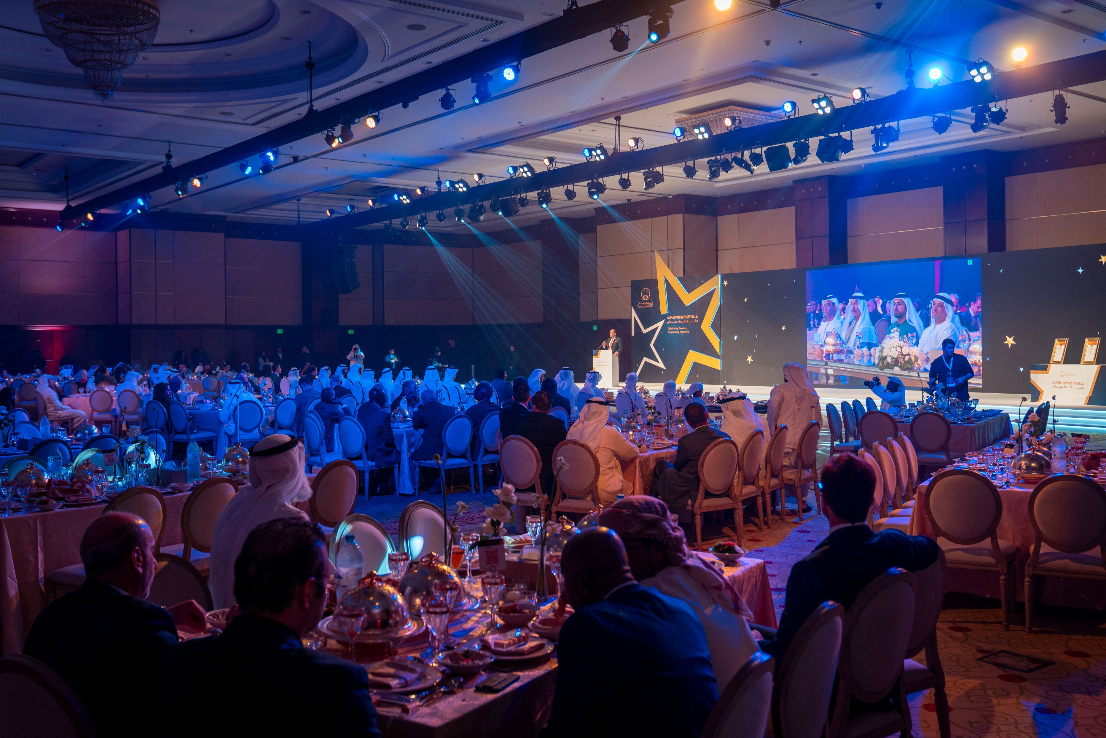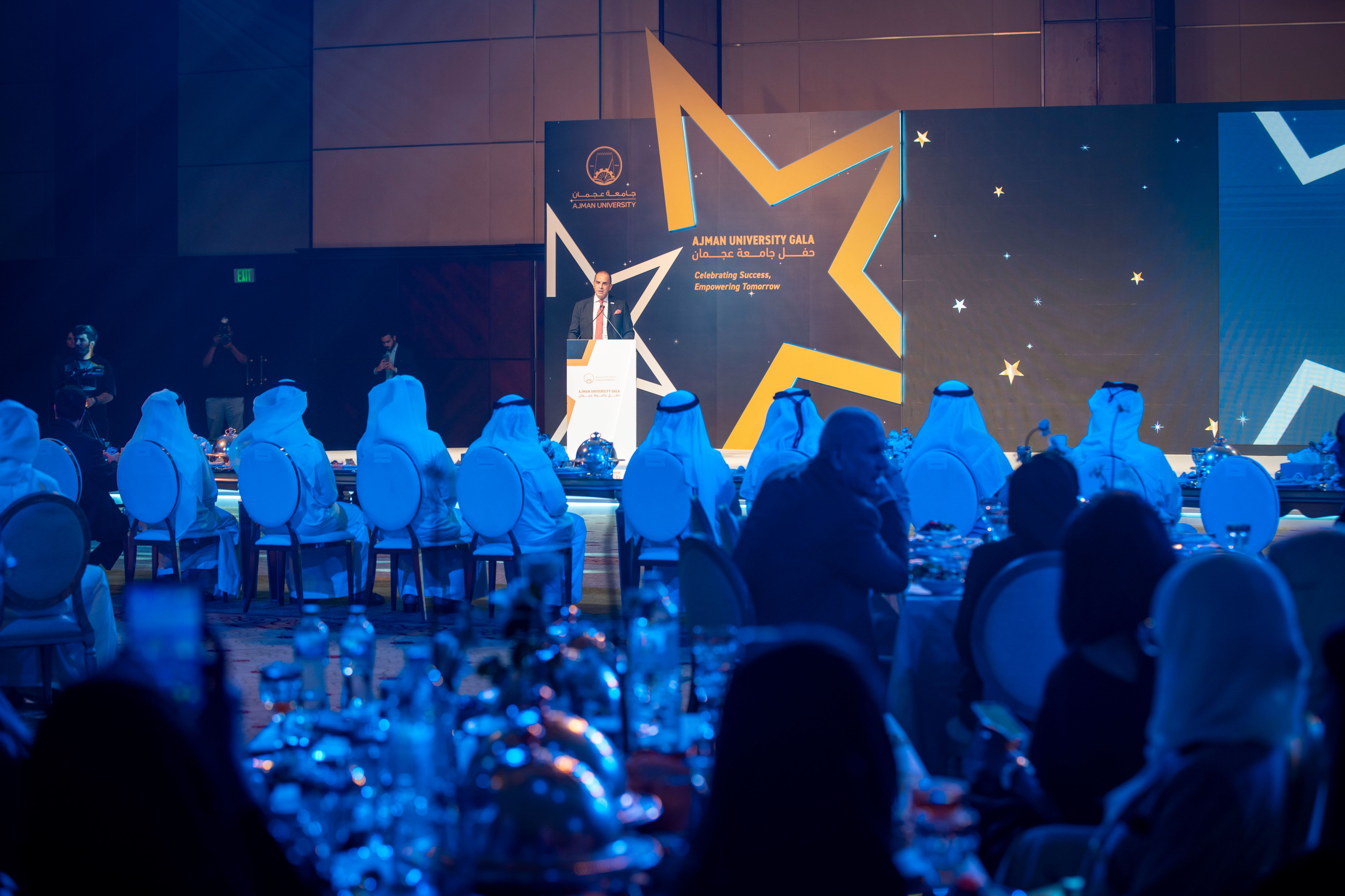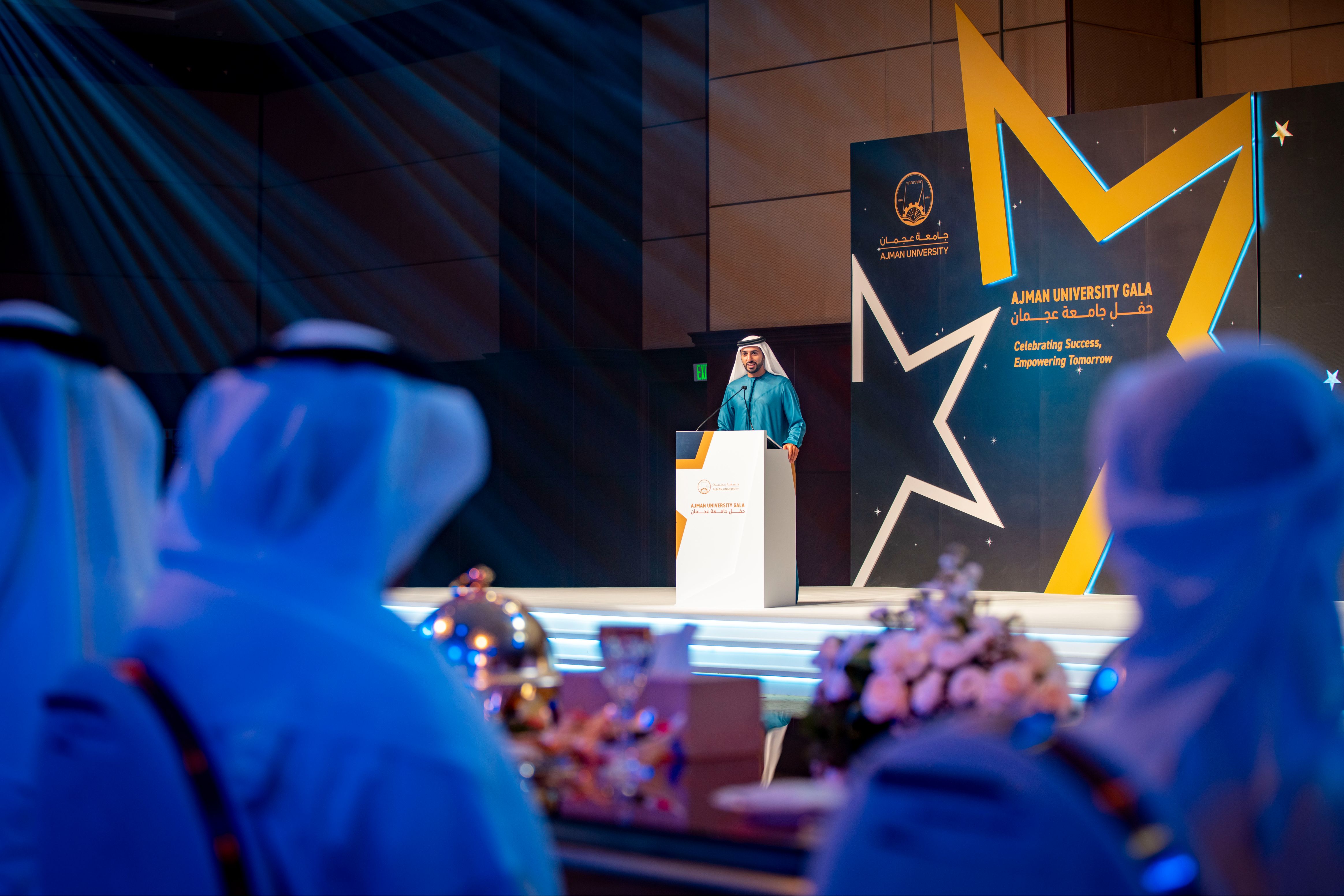 Under the esteemed patronage of His Highness Sheikh Ammar bin Humaid Al Nuaimi, Crown Prince of Ajman, Chairman of the Executive Council, and Chairman of the Board of Trustees of Ajman University, Sheikh Rashid bin Humaid Al Nuaimi, Chairman of Ajman Municipality and Planning Department and Vice Chairman of Ajman University's Board of Trustees, attended Ajman University Gala celebrating the University's recent local and international achievements.