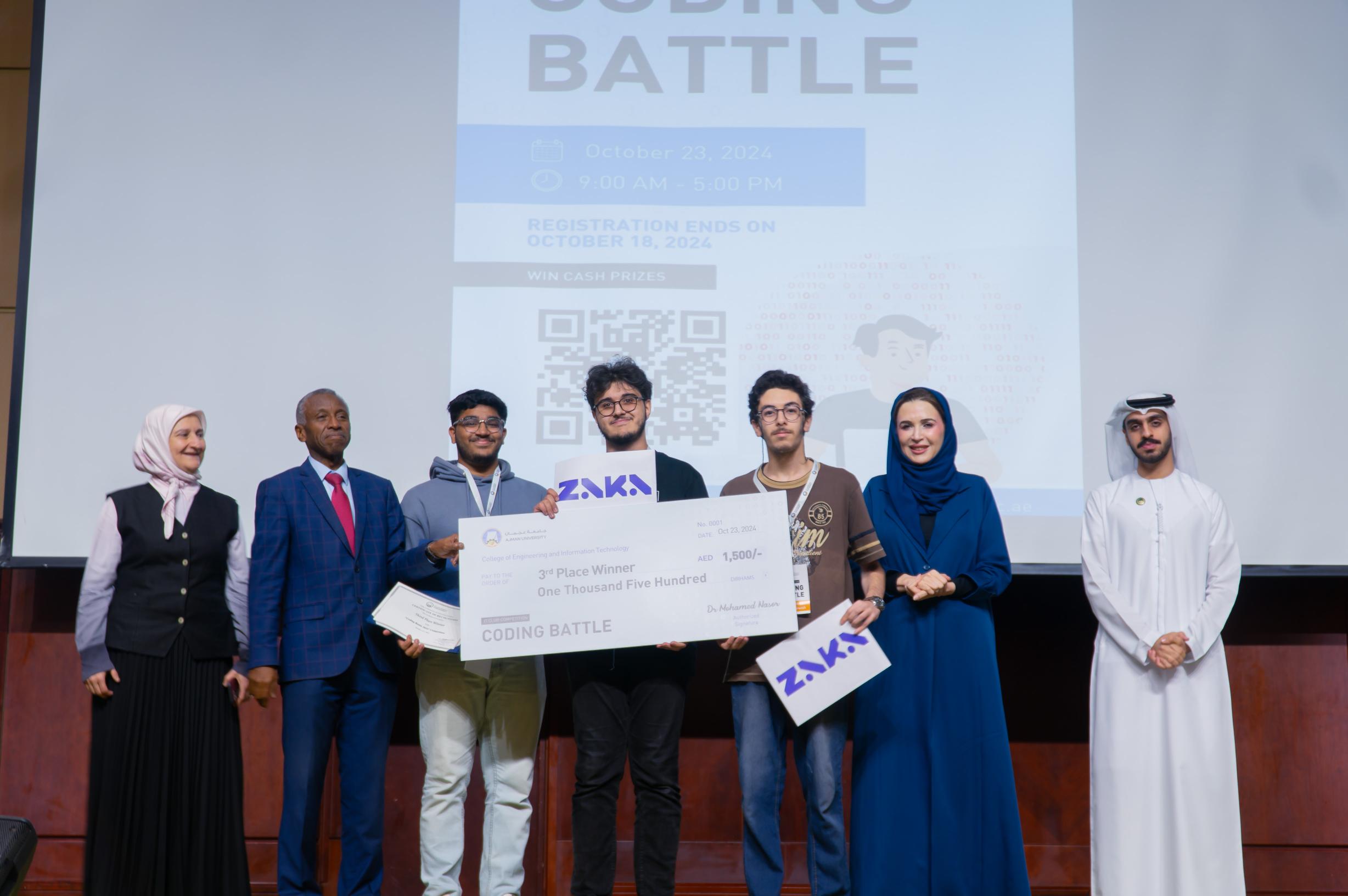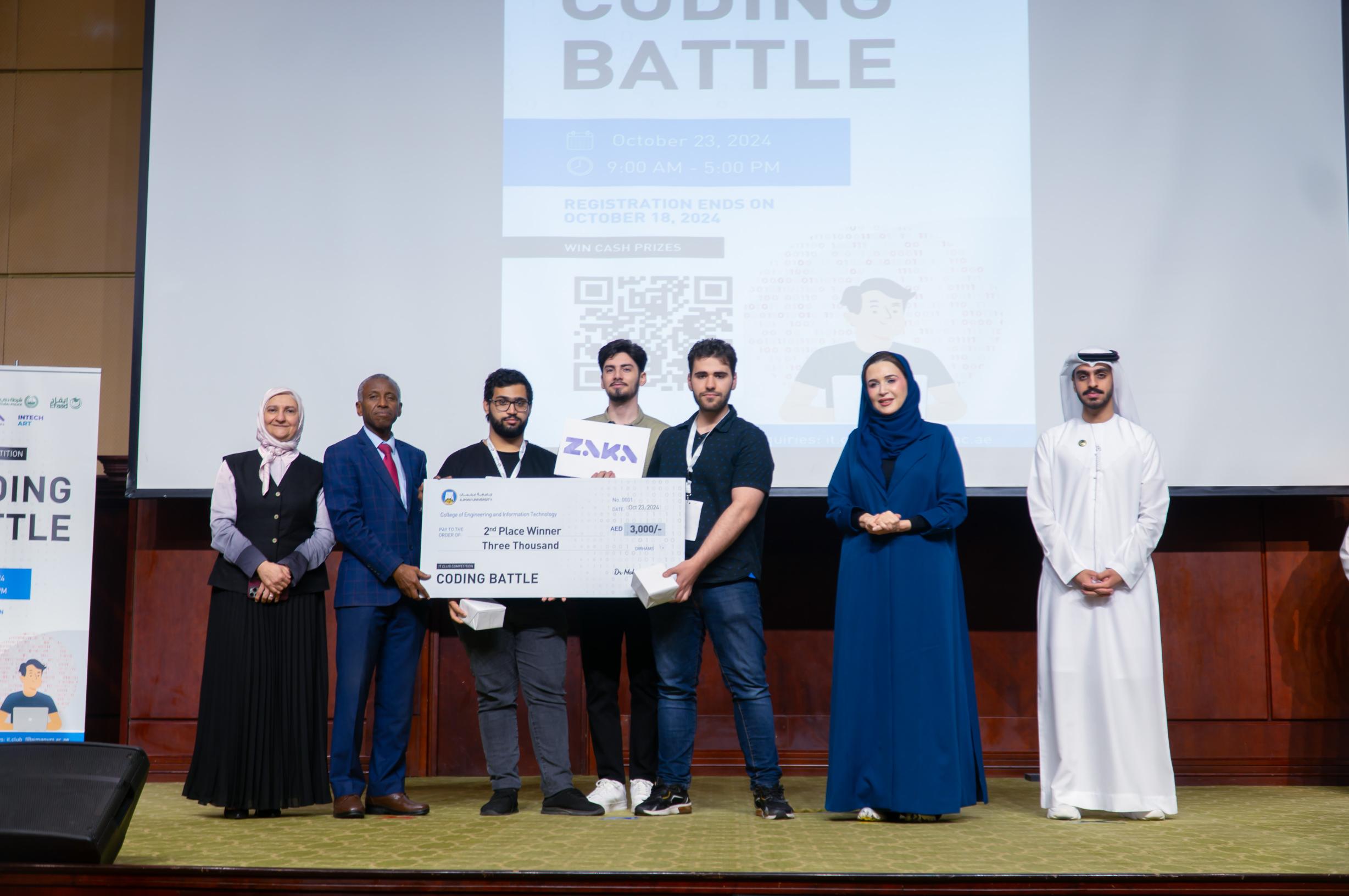 The IT Club within the Department of Information Technology at Ajman University’s College of Engineering and Information Technology, in partnership with the Office of Student Life, hosted the highly anticipated “Coding Battle 2024.” This event, organized in collaboration with Dubai Police, the Council College and University of Dubai Police, Zaka Ambassadors, and INTECH ART, brought together 25 teams in an exciting showcase of programming talent. The competition featured 25 teams, including 15 teams with 41 male students and 10 teams with 30 female students.