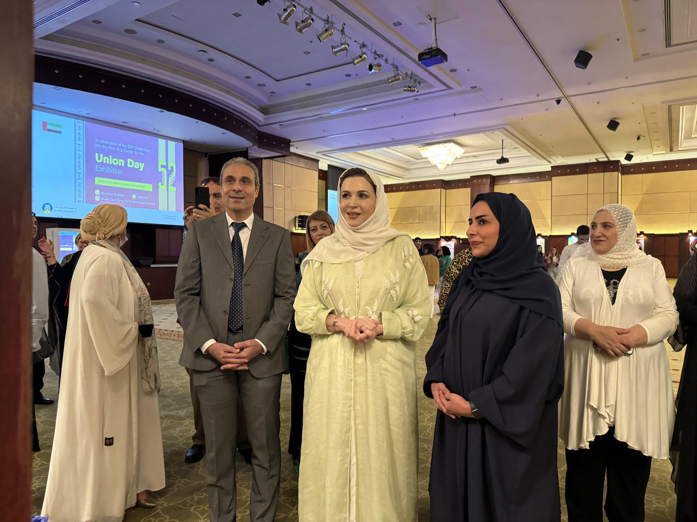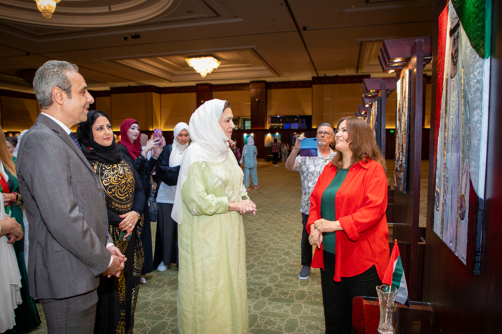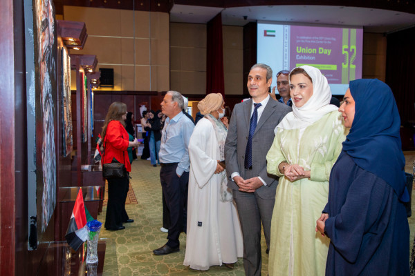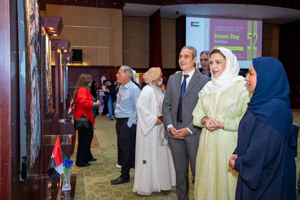 Dr. Nahla Al Qassimi, Dean of Student Services at Ajman University, inaugurated the Union Day Exhibition at Sheikh Zayed Center, an initiative of the Fine Arts Center at the Office of Student Life. Dr. Mohamed Helal, Director of Student Life, and Ms. Mona Mohammed, Senior Officer of Arts and Student Activities, attended the opening ceremony.