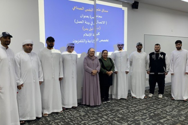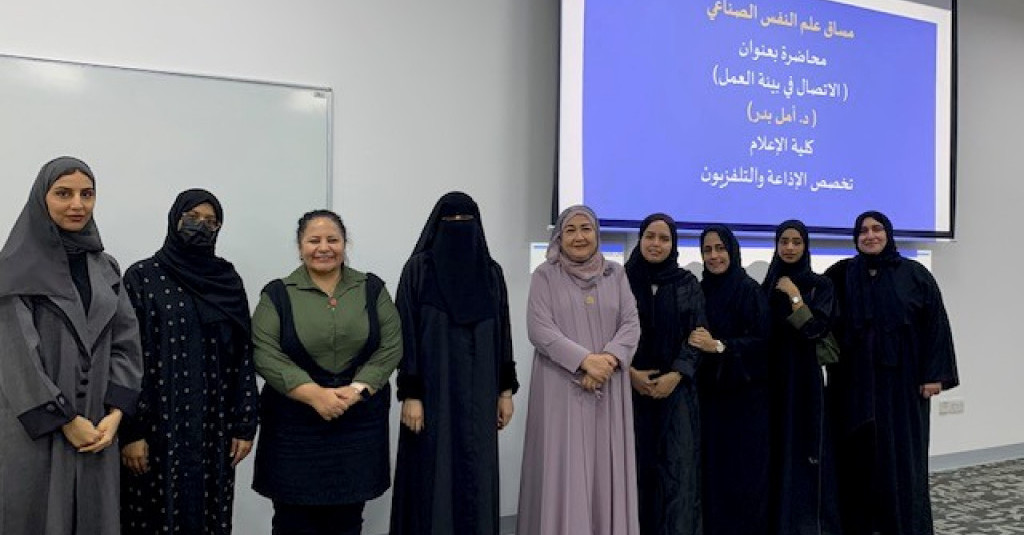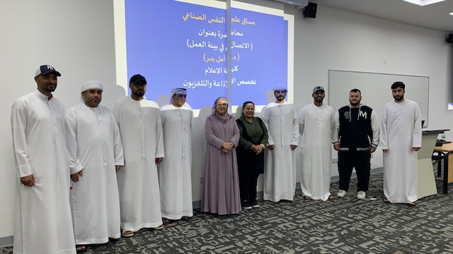 Within the framework of academic cooperation and exchange of experiences between faculty members at Ajman University, Dr. Amal Badr, Associate Professor at the College of Mass Communication, participated in a lecture entitled (Effective Communication in the Workplace) for students of the Industrial Psychology course; under the supervision of Dr. Dalia Bedawi, Associate Professor at the College of Humanities and Sciences. The lecture focused on strategies for improving communication skills in the workplace, the skills that contribute to achieving effective and successful communication, the importance of delivering messages effectively, the importance of listening, using positive and influential language, encouraging dialogue and open discussion, practicing empathy and understanding, avoiding misunderstandings, respecting different opinions, how to benefit from technology to improve communication, in addition to tips for enhancing communication skills within a professional environment. The workshop witnessed a large attendance of male and female students who benefited from the lecture and confirmed their enthusiasm to apply the skills they acquired in the work environment.