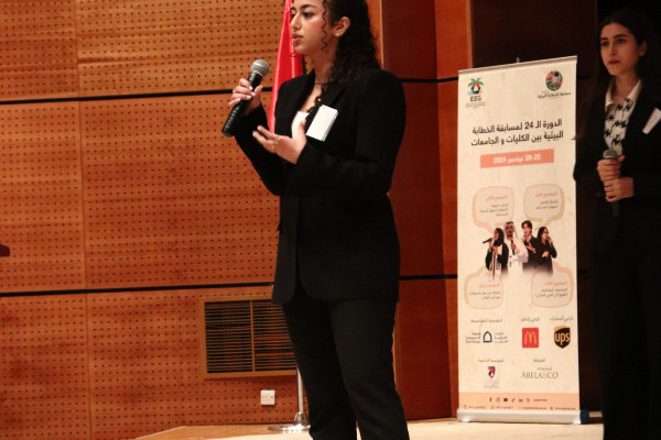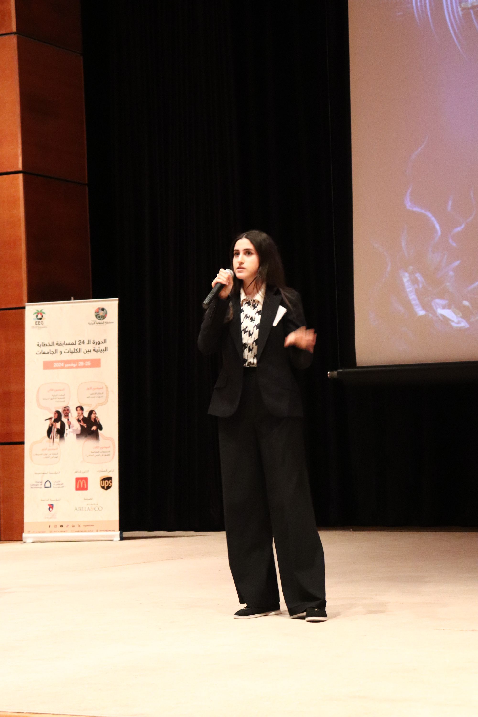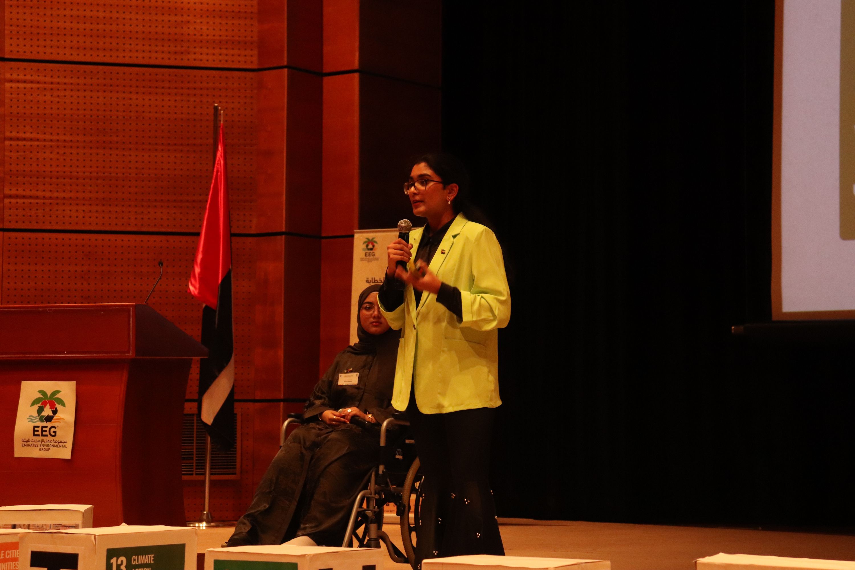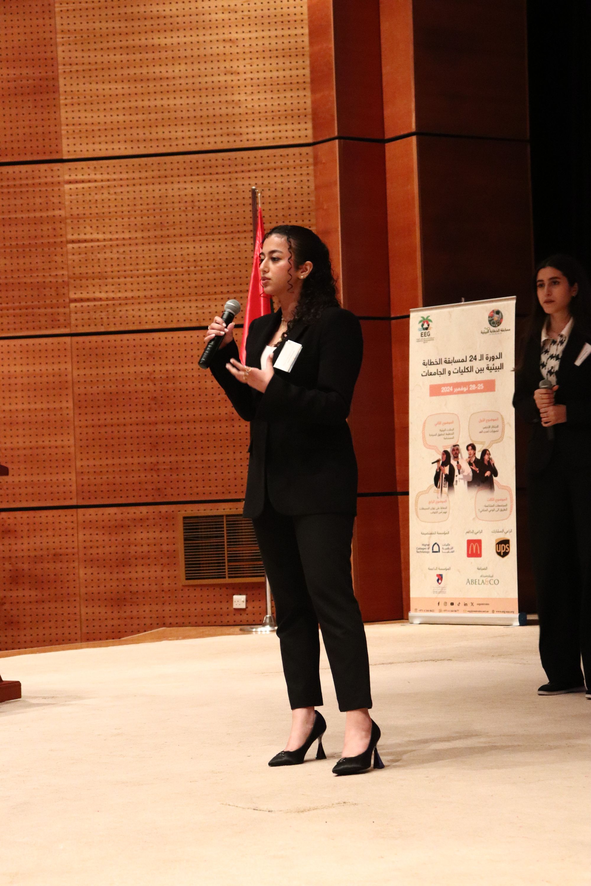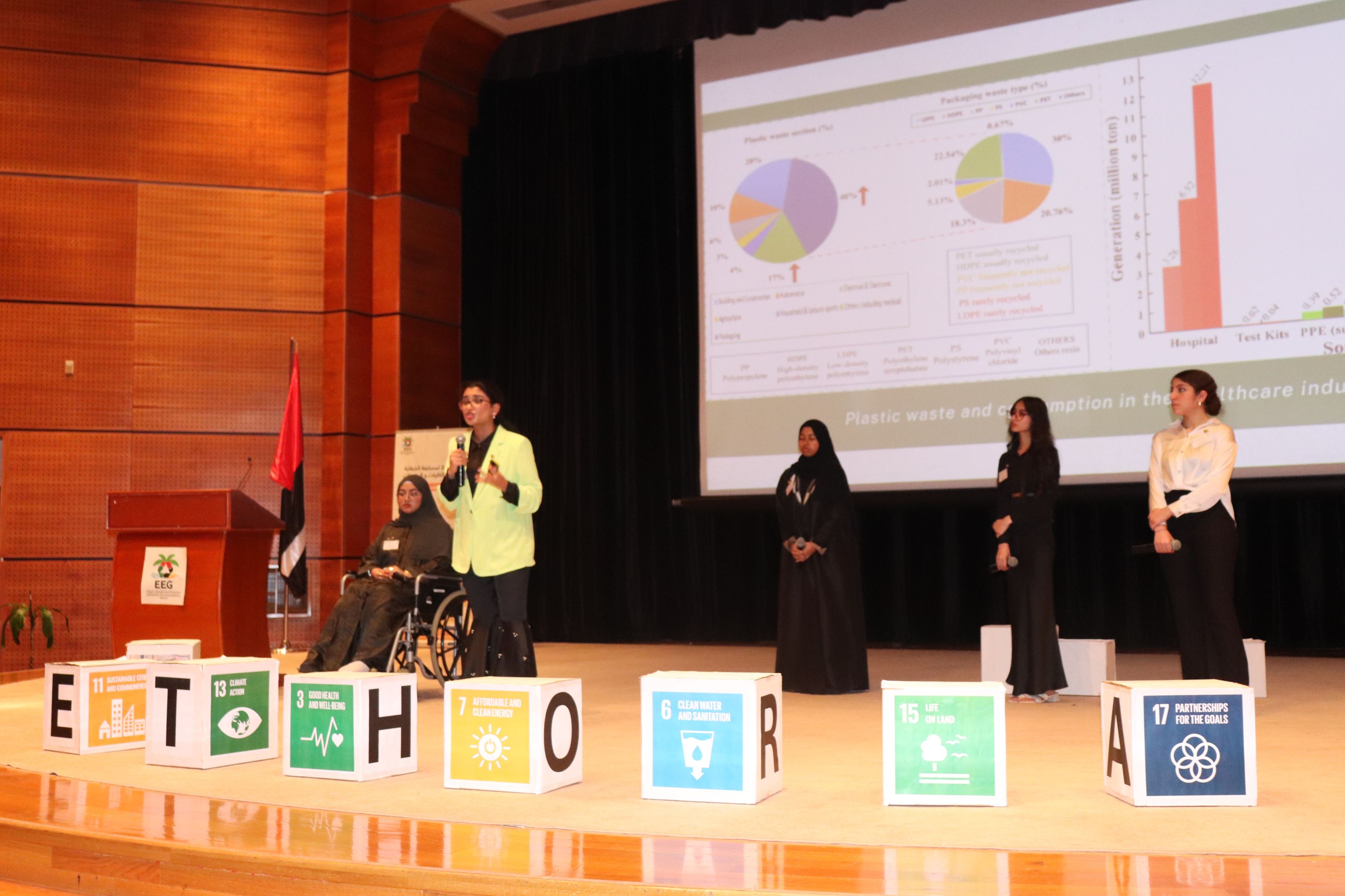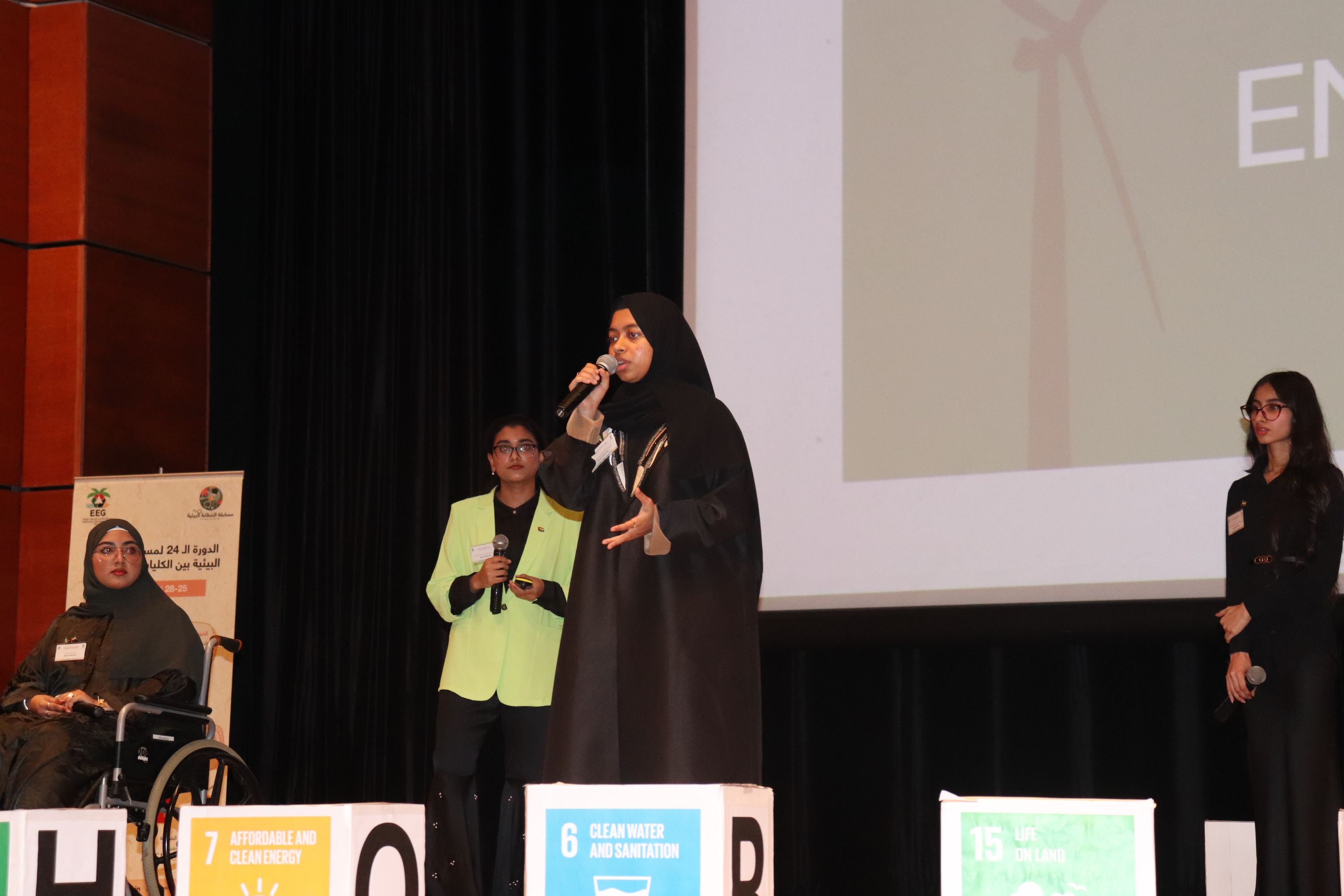 Ajman University students took part in the 24th edition of the Inter-College Environmental Public Speaking Competition, organized by the Emirates Environmental Group (EEG) from November 25 to 28, and hosted by Higher Colleges of Technology – Dubai. This competition serves as a leading educational platform aimed at enhancing youth awareness of environmental sustainability issues, as well as developing their critical thinking, collaboration, and problem-solving skills to address environmental challenges.