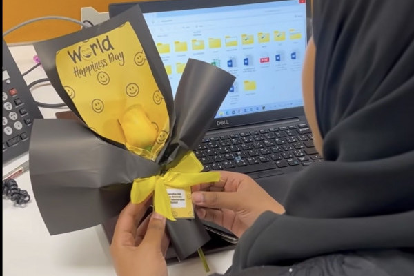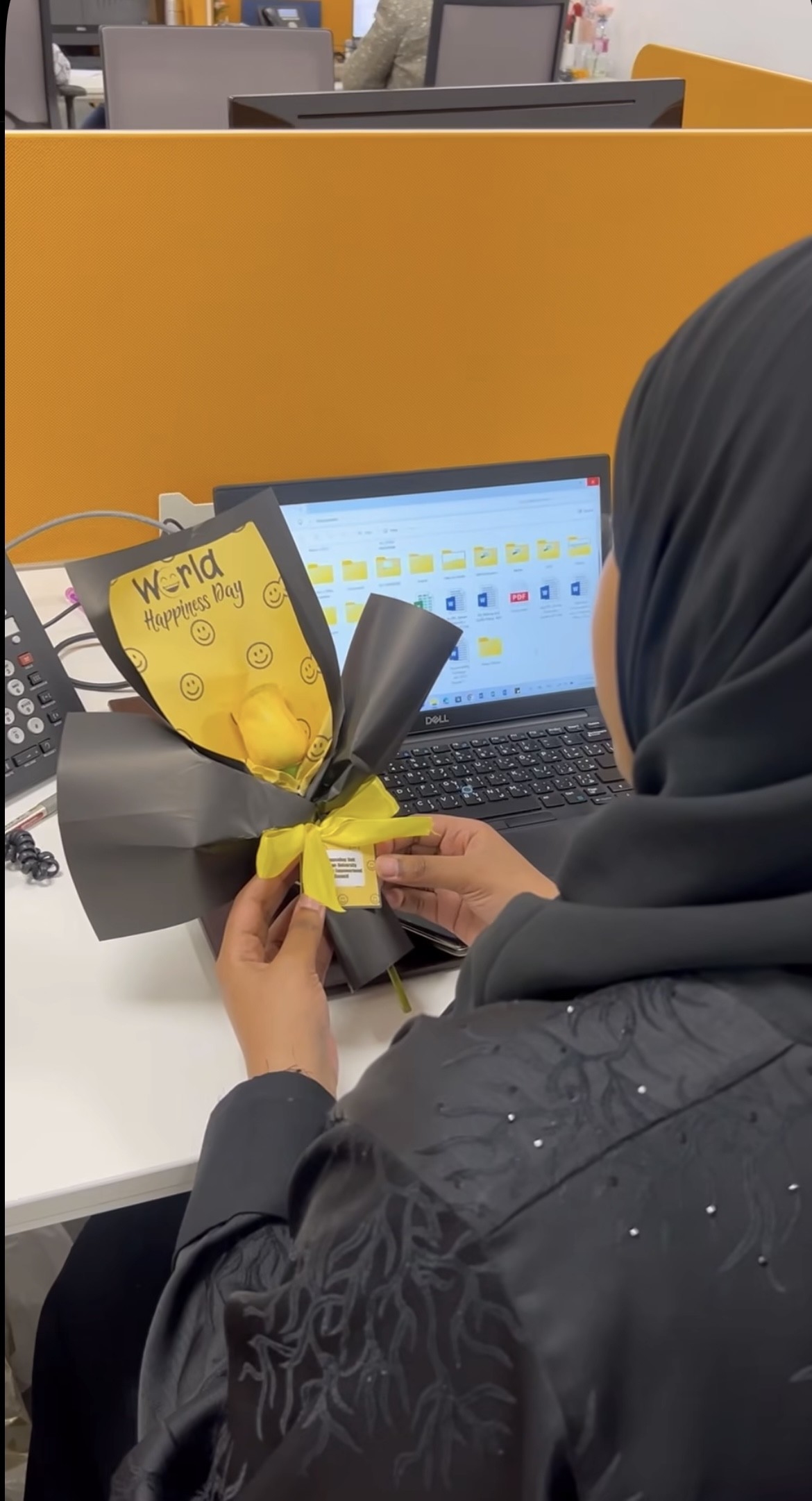 Activities included posting a social media video for Happiness Day, distributing smiley face pins at Ajman University, and creating a poster for members to share what makes them happy. An event titled "Feel Happy and Make Others Happy" was also held, where university offices were visited with gift boxes. Employees selected a present for themselves and one to share with a colleague, aiming to foster workplace happiness and joy.