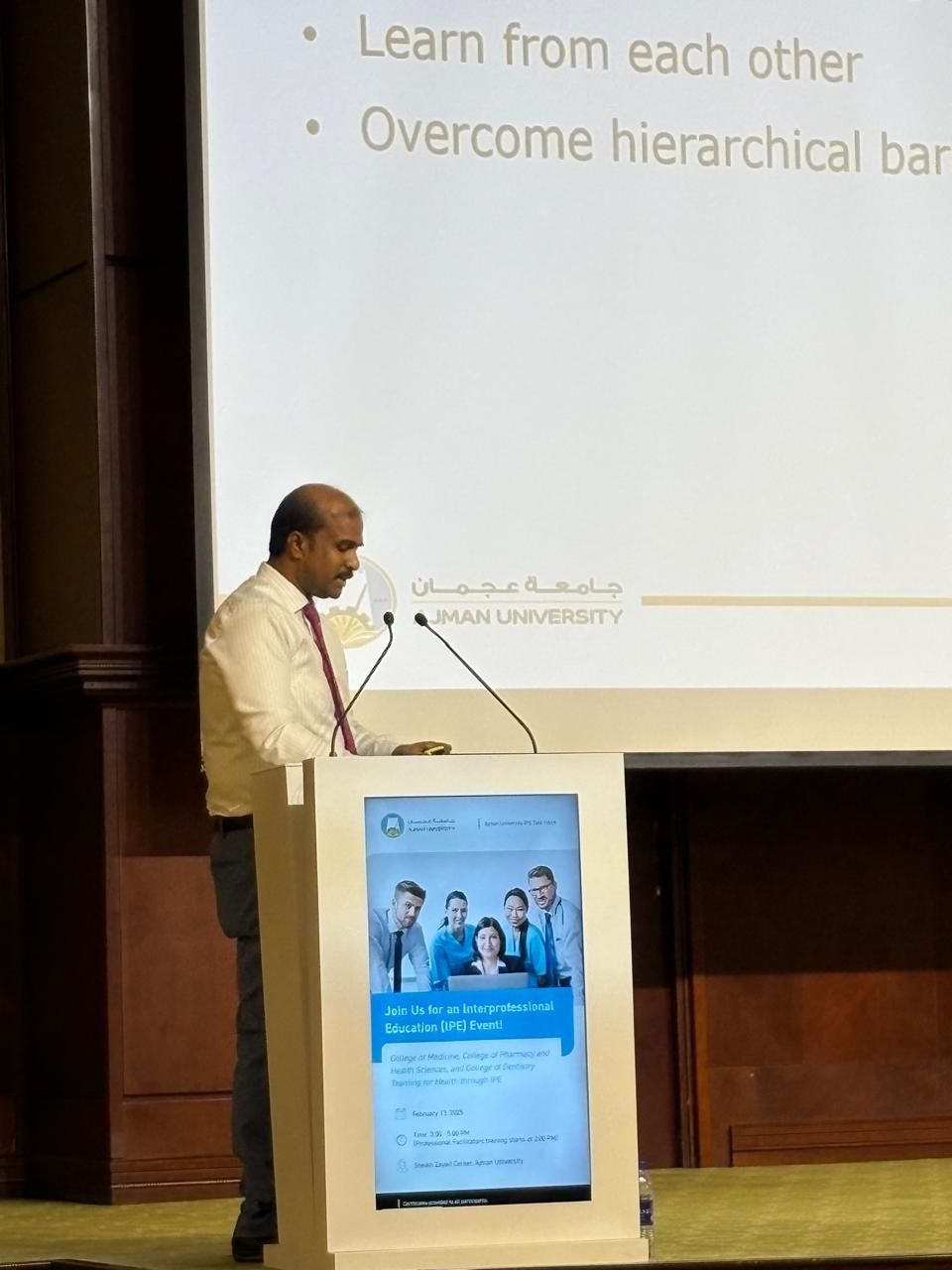 On February 13, 2025, Ajman University successfully hosted an Interprofessional Education (IPE) event themed "Learning Together for Working Together in a Patient-Centered Healthcare System." The event convened students, faculty, and professionals from diverse healthcare disciplines to cultivate collaborative skills and enhance patient-centered care practices.