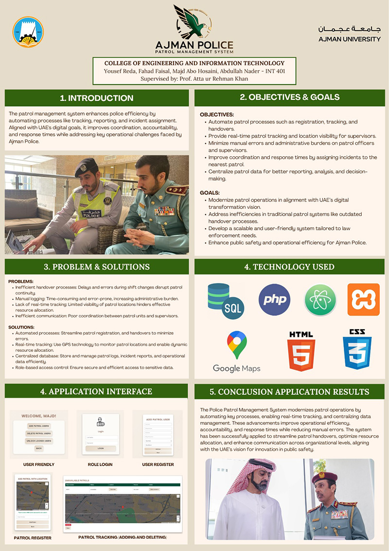 This report describes a systematic approach to patrol operation management at several levels, from Patrol Users to Patrol Managers, Branch Managers and Station Managers. The system provides efficient features for receiving, handing over, replacing patrols and documenting incidents or observations. An automated process to register or replace patrols is available to Patrol Users that captures key information such as name, military number and rank. Also, they can fill in reports for malfunctions and incidents and report directly to the relevant authorities. The vision of the United Arab Emirates, particularly the Ministry of Interior, represented by the Ajman Police General Headquarters, is the realization of this project. It proves the commitment of this initiative to intercultural exchanges through digital services and institutional transformation. This project was inspired by personal experiences and extensive consultations with patrol users and their supervisors motivated by the need to address an outdated patrol logging system. It identified inefficiencies in the patrol handover process and identified the need for an optimized system. As a result, we built a complete patrol management system with exact patrol position on a map and report assignment to the nearest patrol, thus reducing reaction times and meeting operational targets. The system provides tools to Patrol Managers to monitor reports, manage patrol availability, and document actions such as removing or reactivating patrols in the movement log. It also enables us to have a swift follow up on problems and smooth operation. Supervisors can also search patrol activities by specific dates, making the responsibility of oversight much easier. In addition, managers can record and share notes for patrol users and other higher-level authorities, enabling transparency and two-way communication. Security, Investigation and Centre Patrols are advanced tools Branch Managers and Station Managers can use to oversee patrol activities across multiple branches. The system provides a comprehensive overview of patrol operations, and enables precise inquiries, real time monitoring and efficient management. This project enables a complete transformation of patrol system operations in Ajman, by allowing safer and more efficient patrol registrations, seamless transfers and effective communication between all levels of management.