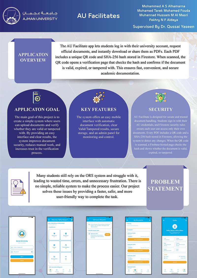 The AU Student Services mobile application is a holistic digital product that will streamline and modernize the procedure of requesting and obtaining formal university documents at Ajman University. In the age when the digitalization of the educational institution is defining the new reality of the sphere, this application will have been an essential solution to a major issue: it will offer students a convenient and secure means of accessing the necessary academic resources without compromising the quality of authenticity and integrity. Historically, students requiring official availments like admission documents, enrolment certificates or academic transcripts have been faced with lot of huddles in the form of time loss due to lengthy processes and making physical trips to administrative offices as well as issues on the security and authenticity of their documents. The barrier of these hurdles is erased by the AU Student Services app which provides a mobile-first experience where authenticated students are able to make document requests, monitor their status in real-time and receive protected digital copies directly on their devices. The system is designed on the basis of the cloud infrastructure provided by Firebase thus utilizing Firestore to store data securely, Firebase Authentication to manage identities, and Firebase Hosting to deliver content reliably. The application uses an advanced document generation framework, which results in PDF files with embedded cryptographic hashes and scannable QR codes, which allow any receiver to immediately check the authenticity of a document using a special verification page. |