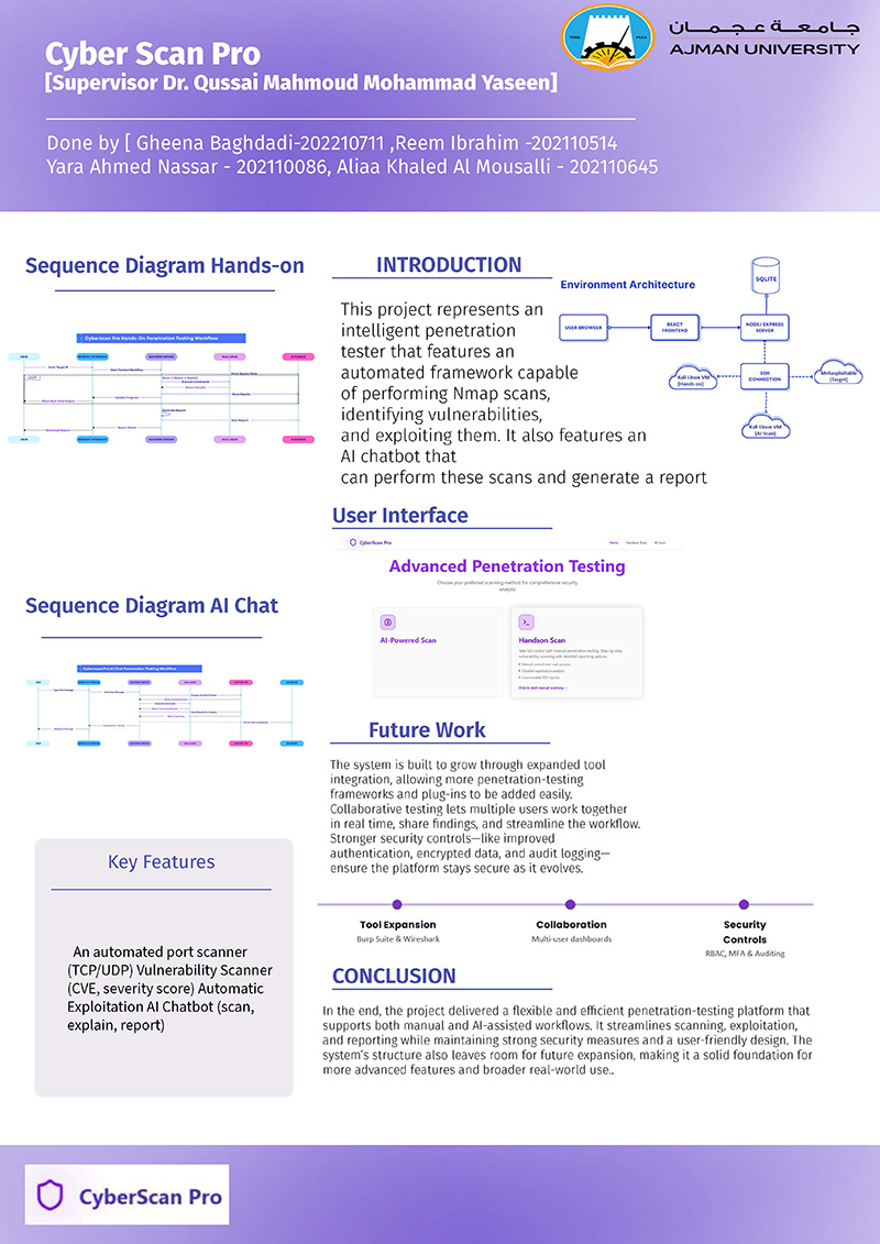 In the known network vulnerabilities scanner, they face a critical problem, which is that they often fail to translate these vulnerability issues in a clear, understandable way for people who do not have a technical background in cyber. This capstone project represents an intelligent penetration testing that has both an automated scan that is integrated by AI and a manual scan that also has a report generated by an AI agent. Our solution is a platform is a user-friendly interface, which helps make it easy for users to access and helps them scan their IP with maximum performance. In summary, this project combines both the use of AI securely and innovatively to help networking students and users in general. Our goal is to improve the report generated by the scans using the AI Agent and to minimize critical vulnerabilities in time. |
