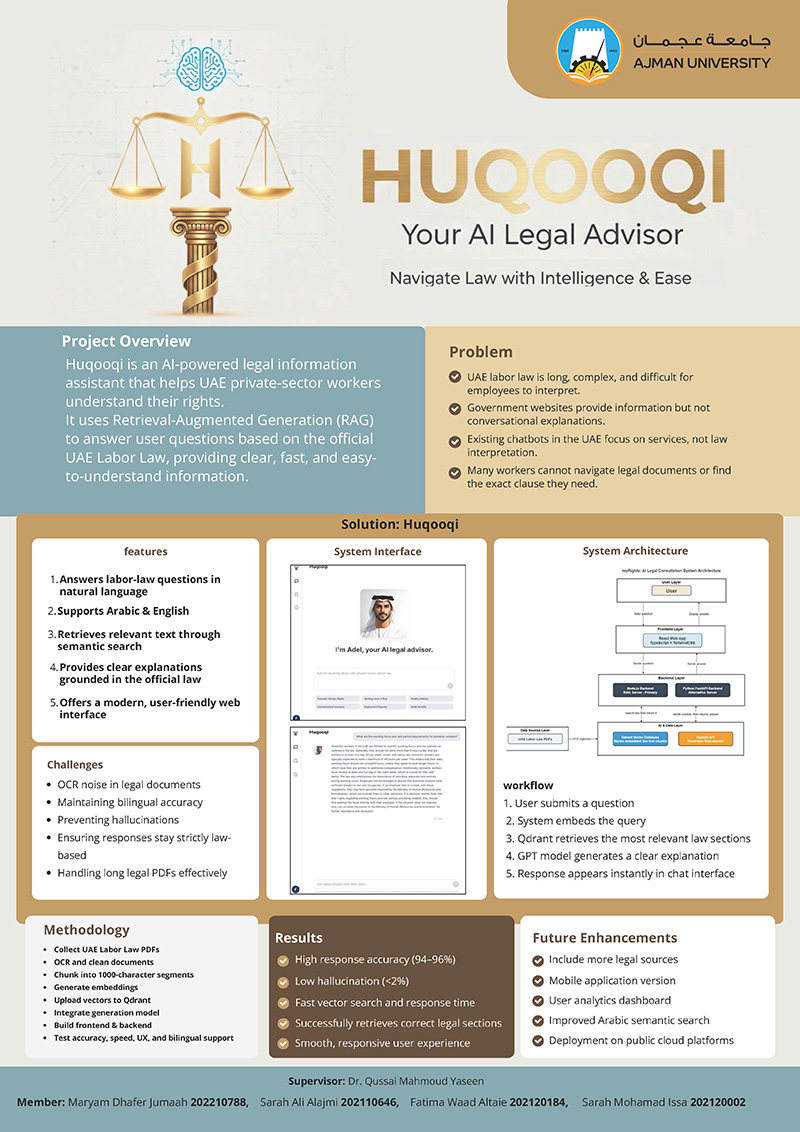 This report is a design, development, and evaluation of a bilingual UAE Labor Law Assistant, which is an application that runs on Retrieval-Augmented Generation (RAG). The project aims to deliver the correct answers to employment-related questions in Arabic and English based on the artificial intelligence and with legal foundation. The system combines the OpenAI GPT language model to build natural language with semantic similarity search using Qdrant vector database, as all the responses generated are also trackable to the official legal documents. The frontend is developed using React and the Tailwind CSS, which is backed by the Axios, used to make API calls and styled to meet the needs of responsive user interaction. The fastapi, mongoDB to store structured data, and qdrant to search vectors are used to develop the backend. A well-organized development process, based on Agile principles, made it possible to continuously add new features and continuously test them. Testing stage included unit, integration and end-to-end testing to confirm the performance of the backend, responsiveness of the front end and consistency of the user experience between devices and browsers. The special attention was paid to security, performance optimization, and multilingual support. The system had a high rate of response accuracy of 94-96 percent as well as a hallucination rate of less than 2 percent. Reliability requirements of legal AI systems led to the implementation of error handling, traceability and legal citation mechanisms. The present project proves the validity of incorporating AI into legal advisory devices and provides a scalable and user-friendly method of legal awareness in the UAE labor market. . |