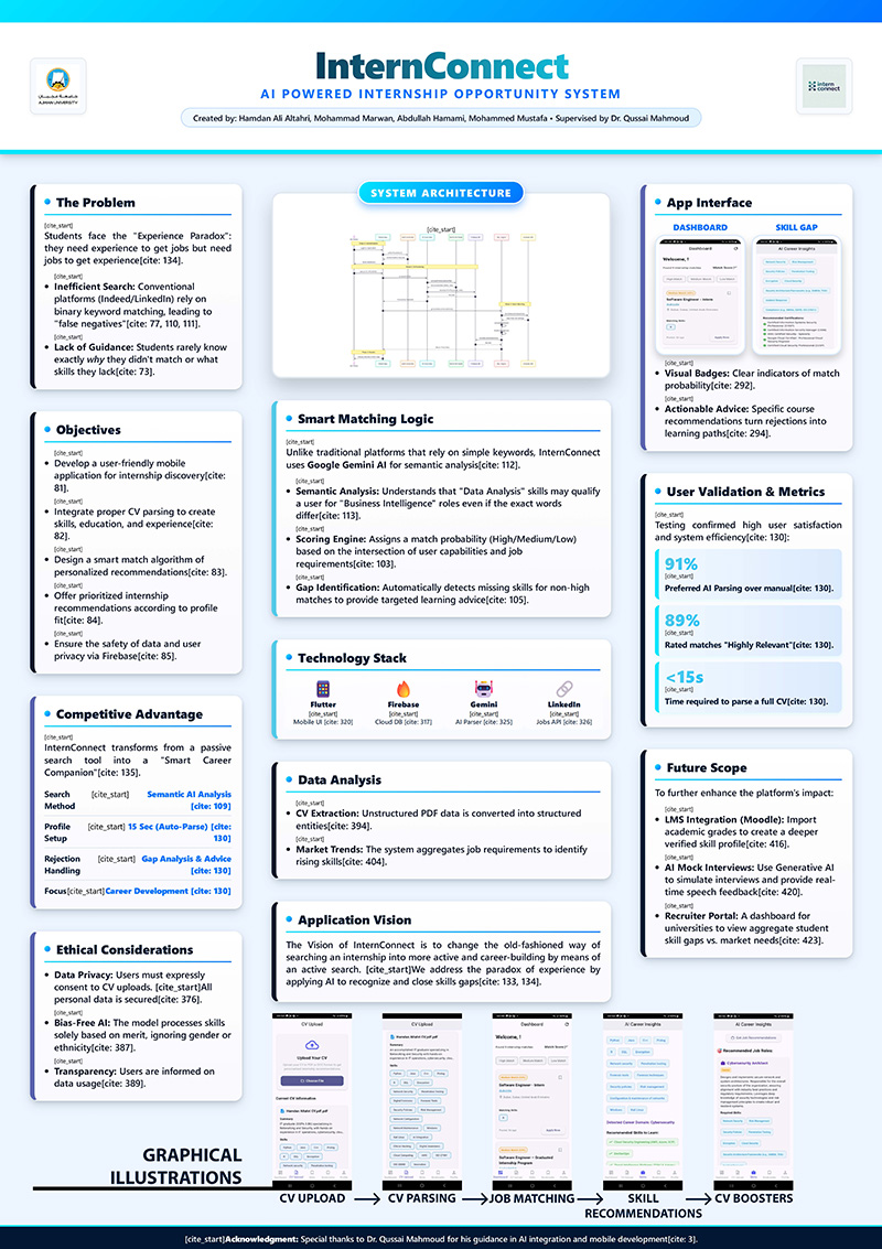 The students have a big problem of securing relevant internship programs which align with their skills and qualifications. The conventional methods of job searching are usually associated with manual search through multiple postings, meaning that there are inefficient matches and lost opportunities. This report presents our new product, InternConnect, a Flutter-written mobile application that is based on smart CV analysis via AI and offers user-specific internship recommendations. We will take the approach of extracting the important information about the student CV such as the skills, education, experience and match them with the specific internships using the help of smart algorithms. We have managed to work out a fully functional application with the user authentication, uploading and parsing of CVs, the analysis of skills and a recommendation engine. The system will offer ranked internship recommendations (High, Medium, Low match) through the profile compatibility.as we have will combine the LinkedIn Jobs API to give real-time internship data and develop the matching algorithm with the help of machine learning. Since we have introduced the features that will pull out the education domain in CVs and avail the needs and skills that are required to equip the students with what they need in the market in future. |