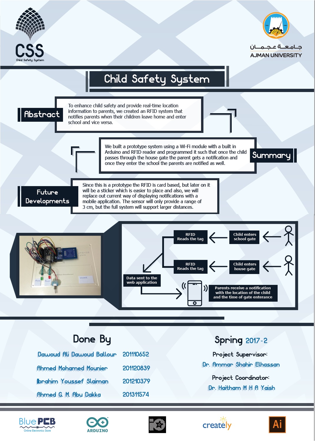 | Abstract | The number of two working parents has grown exponentially in the past several years, and they are working full time. Parents now spend less time with their children to the extent where they don’t even see them go to school or come back from it, and they always worried if they made it to school safe and attended their classes or not. In this project we hope to be able to design a system using a Wi-Fi module and an RFID sensor kit that will act as a gate for the house and another that will act as a gate for the school and an RFID card that will be carried by the child who once passes through either of the gates the parent will get a notification through a website. Our project success criteria will depend on making this gate bug free within the time frame allocated for this project and also to be able to work together as a team to deliver such a system. |
