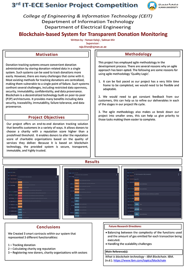 Donation tracking systems streamline donation management by consolidating all donation-related data into a single platform, allowing donations to be monitored efficiently and effectively. Despite this, tracking and monitoring donations remain one of the most significant challenges faced by organizations and donors today. Most existing donation tracking methods are centralized, making them susceptible to single points of failure. Additionally, these systems encounter several issues, including limited data transparency, security vulnerabilities, lack of immutability, confidentiality concerns, and difficulties in establishing data provenance. Centralized storage also makes it challenging to demonstrate the credibility, trustworthiness, and reliability of charitable organizations. Blockchain technology, built on decentralized peer-to-peer (P2P) architectures, offers solutions to these challenges. It provides enhanced data security, traceability, immutability, fault tolerance, and reliable data provenance. The aim of this thesis is to propose a blockchain-based system for accurate tracking and tracing of donations made by donors. The system ensures that donation management is accessible only to registered and authorized parties. Our approach involves designing and implementing a set of smart contracts to govern business processes among the involved stakeholders. The system is developed using Solidity within the Remix IDE, and its blockchain implementation is demonstrated using the Ganache tool. |
