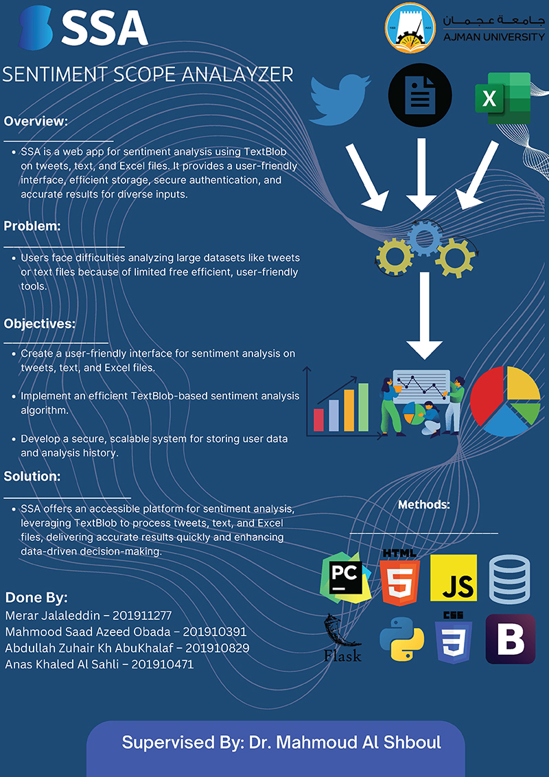 IThe rapid growth of social media and other online platforms has led to a surge in the availability of textual data, making sentiment analysis increasingly crucial for understanding public opinion on various topics. This report presents Sentiment Scope Analysis (SSA), a web application developed to enable efficient, real-time sentiment analysis of Twitter data, text inputs, and Excel files. Using the Python-based TextBlob library for Natural Language Processing (NLP), SSA provides a user-friendly interface to analyze sentiment, making data-driven insights accessible to users without a background in data analysis. The application supports secure user authentication, efficient data storage using SQLite, and robust data retrieval functionality. Challenges encountered during development, such as changes to Twitter's scraping policies, and their respective solutions are discussed. The report concludes with an evaluation of SSA's performance, user feedback, and potential future enhancements to improve data visualization, add more data sources, and extend analysis features. |
