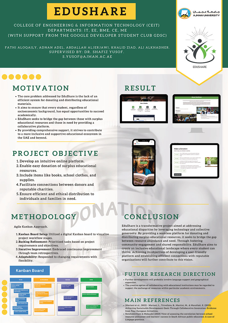 EduShare is an innovative and charitable organization that seeks to change the lives of impoverished families, both here in the United Arab Emirates and worldwide. This project is all-encompassing and is aimed at the donation and distribution of fundamental education resources that include books, school clothes, supplies, and academic materials. The main purpose of EduShare is to close the gap between those who have surplus educational resources and those who do not have enough of them. Through cooperation and involvement of the community, EduShare offers a platform with simple navigation where people can easily help develop education for deprived groups. Through EduShare, donors can easily share surplus items of value such as textbooks, school uniforms, stationery, computers, and other academic resources on a user-friendly and simple online platform. The platform is similar to an intermediary that links benefactors with credible charities and organizations that have the mandate to help needy families and students. This uninterrupted link enables the delivery of donated supplies to the targeted students; hence the recipients benefit from the education journey of the destitute. EduShare foresees a future where all students will have the necessary tools to fulfill their academic objectives regardless of the economic background they were born in. Through the creation of an environment of philanthropy, EduShare not only assists students but also facilitates the construction of a fairer and more stable learning system. EduShare is not only a platform but also a catalyst for positive changes in education. Whether people choose to donate or volunteer, EduShare remains a symbol of inspiration that contains the strength of community spirit to realize the student's dream. |
