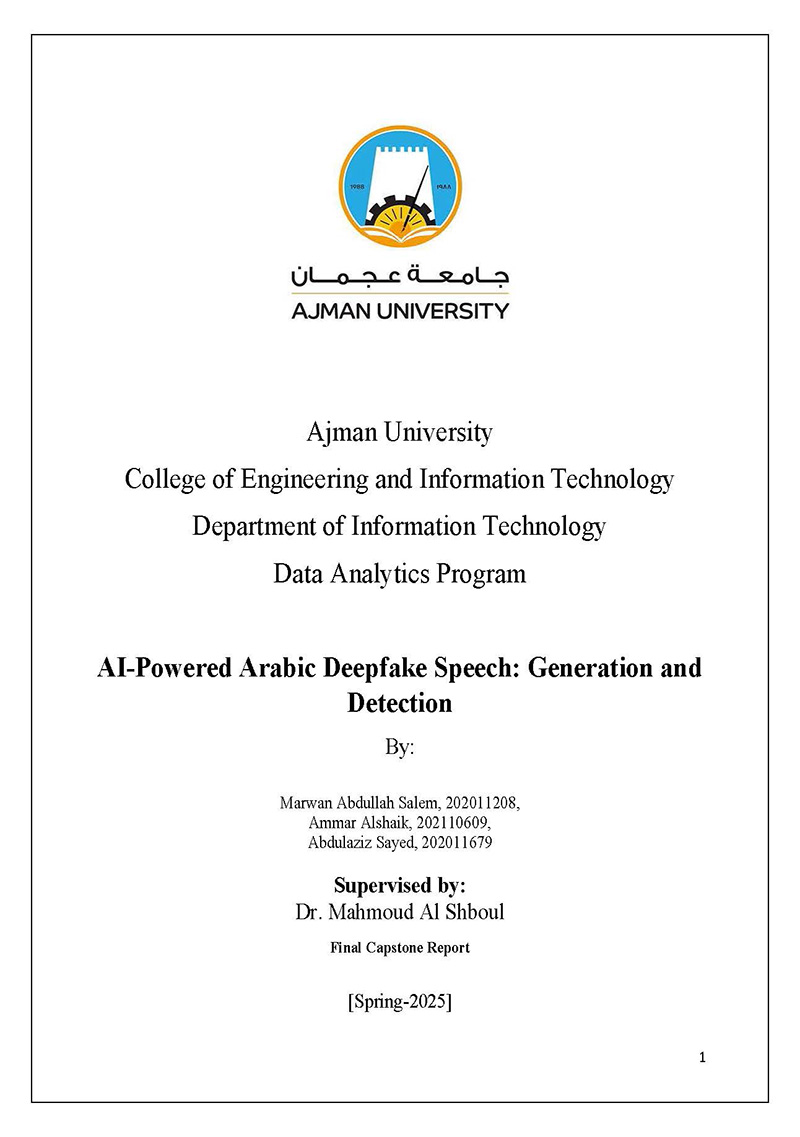 The increasing sophistication of AI-generated speech has raised concerns over its misuse in voice impersonation scams and digital fraud. This project aims to develop a system capable of both generating and detecting deepfake Arabic speech to mitigate cybersecurity threats. Utilizing Coqui XTTS-V2, a state-of-the-art text-to-speech (TTS) model, we generate high-fidelity Arabic speech samples. The training process relies on the Arabic Speech Corpus dataset, ensuring realism. To resolve potential misuse, we implement a deep learning-based detection model trained to differentiate between authentic and synthetic speech. Preliminary results demonstrate the model’s effectiveness in classifying deepfake audio with high accuracy. Performance evaluation includes precision, recall, and overall detection rates, validating the system’s reliability. The findings underscore the need for enhanced detection mechanisms to address security risks posed by AI-driven voice synthesis. This research contributes to digital forensics by offering a dual approach both generating and detecting deepfake speech to strengthen security measures. Future work will focus on refining real-time detection capabilities and expanding dataset coverage for improved robustness. |