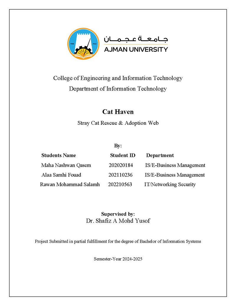 There are thousands of stray cats roaming across residential areas in the UAE, and their suffering from starvation, disease, and injuries is growing to be a concern of seriousness. Though community volunteers and shelters work tirelessly, the efforts are still quite scattered due to the problem of a non-centralized mechanism to report, rescue, and adopt these stray cats. Cats Haven will fill this gap: a user-friendly WordPress site will be designed as a bridge connecting those who see stray cats and rescuers and adopters. Built using WordPress Elementor, the user can report a stray cat sighting simply by uploading a photo and specifying its location. The provided information will be accessible to authorized individuals for the efficient coordination of rescue missions, medical interventions, and an adoption process. A standardized approach to stray cat care proposes that Cats Haven champion efforts to save and rehome these cats with the community around. This project resonates with some of the UN Sustainable Development Goals: Life on Land (Goal 15) relates to humane population management of stray cats, while Sustainable Cities and Communities (Goal 11) discern organization of rescue efforts and Good Health and Well-being (Goal 3) recognizes verifications keeping notation of vaccinations meant to counter potential threats arising due to zoonotic diseases. Standardization applies to data and ease of processes for adoption for the community supporting pet adoption by nurturing sustainable and humane ways of cohabitating with stray cats in the UAE. |