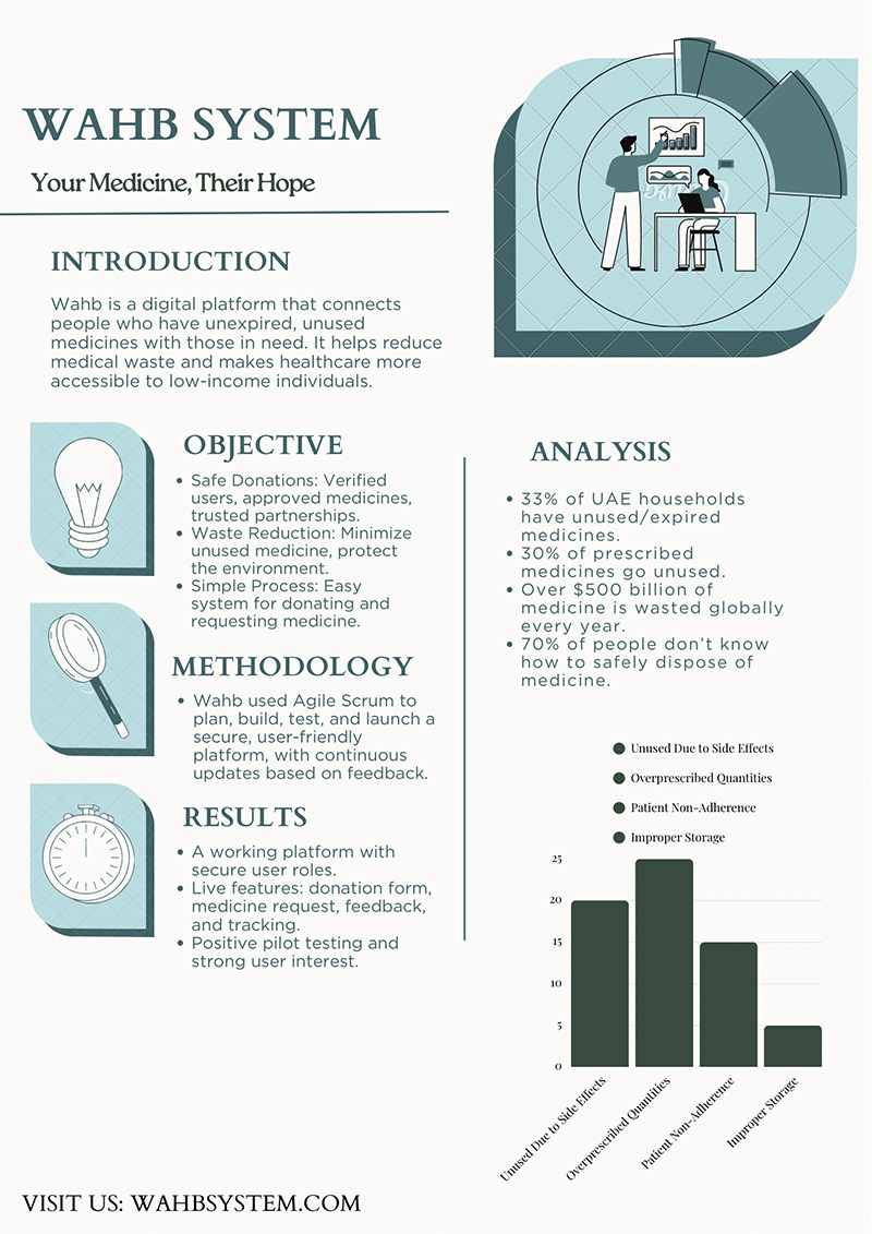 Wahb, comes from the Arabic word meaning “to give generously,” is a digital platform designed to bridge the gap between individuals that have unexpired medications and those in essential need of them. At its core. Wahb aims to reduce medicine waste, improve public health accessibility and to promote sustainable practices. Every year a significant quantity of unused medicine is wasted, resulting in environmental harm and financial loss. Wahb offers a secure, community-centered system that ensures these valuable resources are safely shared with those in need instead of ending up as waste. Wahb was created to help with the big problem of the expensive and hard to find medicines. It is a simple and also easy to use system where people can donate or request the medicines. Wahb also cares about helping the environment and making a difference in the society. It supports the global goals like good health (SDG 3), better and safer cities (SDG 11) and using the resources in a smart and responsible way (SDG 12). Wahb is not just a donation platform, it is a vision for a healthier and more Caring society. With built in security, a simple interface and a strong sense of community support. Wahb empowers the individuals to participate to a greater cause. From the streamlined verification and the delivery processes to the inclusive design for users with the limited technical skills, every element of Wahb reflects its mission: “Your medicine, their hope.” |