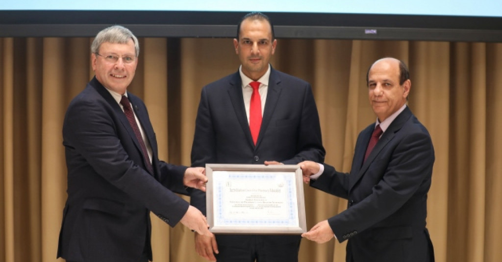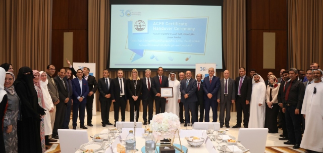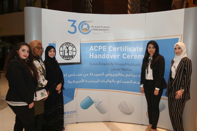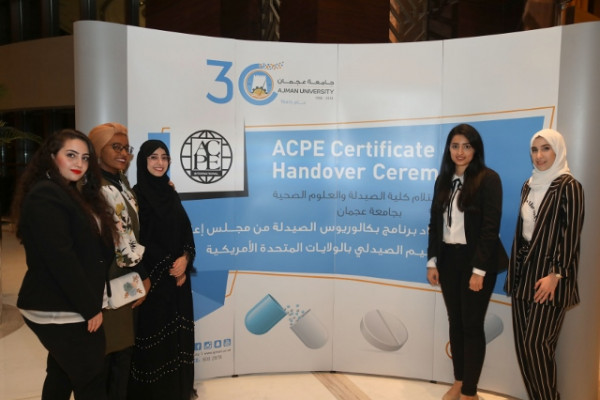 Ajman University’s College of Pharmacy and Health Sciences’ BPharm program was officially granted International Certification by the prestigious US-based Accreditation Council for Pharmacy Education (ACPE) in July. The certificate handover was carried out in an official ceremony on September 12, 2018 at the Fairmont Hotel, Ajman.