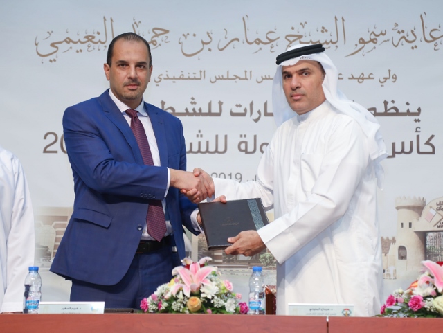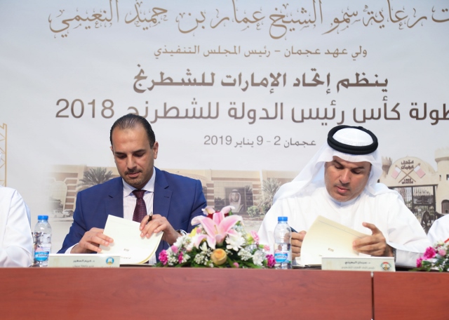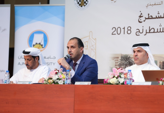 The conference was attended by Dr. Sarhan Al Meini, Chairman of the Organizing Committee, Dr. Karim Seghir, Chancellor of Ajman University, Mr. Hussain Al Shamsi, Secretary General of the Arab and Emirati Federations, and Saud Al Jasmi, Director of Event Section at Ajman Tourism Development Department (ATDD). In addition, the press conference witnessed a signing of a memorandum of understanding between the Chess Federation and Ajman University.