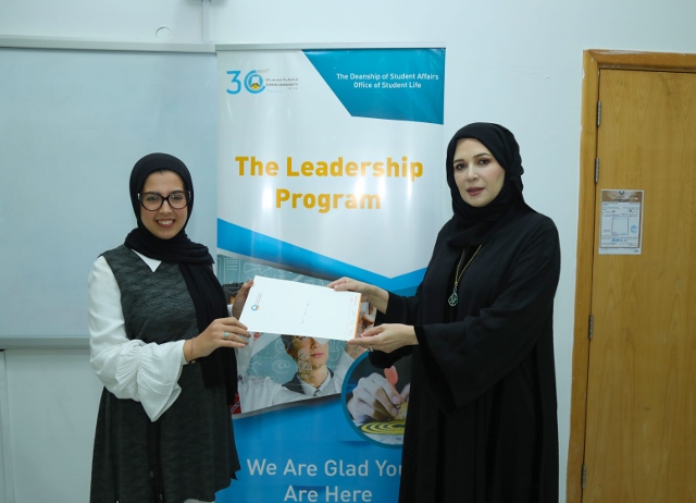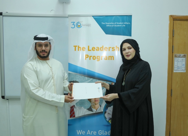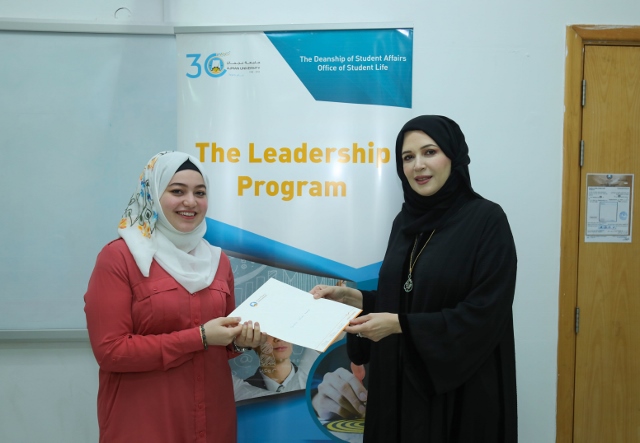 At the end of the program, Dr. Nahla Al Qassimi, Dean of Student Affairs, honored 29 students who completed the program, stressing that building the student leader is the most important challenge addressed by the Deanship of Student Affairs at Ajman University through the leadership program and other programs organized by the Deanship throughout the year.