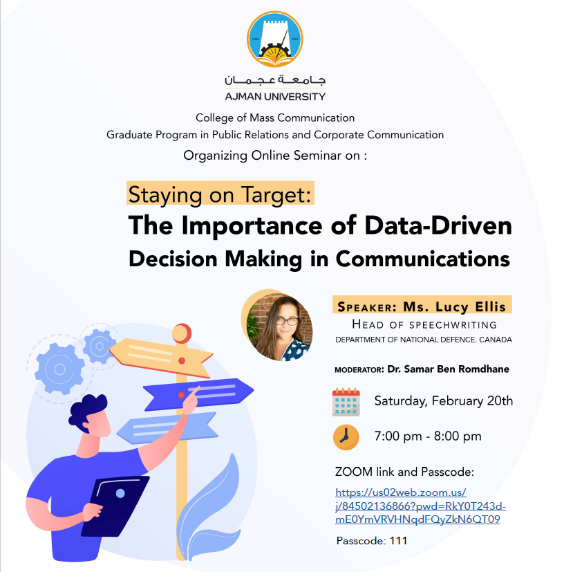 Within the activities of the Master program of Public Relations and Corporate Communication, the College of Mass Communication organizes a webinar entitled "the importance Data-driven decision-making in communications". The webinar is presented by Ms. "Lucy Ellis", Head of Speech Writing Department at the National Defense in Canada, and moderated by Dr. Samar bin Ramadan, Assistant Professor at the College.