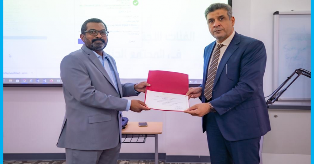 As a part of the College of Mass Communication's efforts to enhance the knowledge and expertise of its students; the College Dean, Dr. Hossam Salama hosted the Director of the University’s Library, Mr. Abdullah Al-Taher, to share his experiences in a workshop entitled "Skills for Using the University Databases". During the workshop, Mr. Al-Taher shared and explained the required skills for dealing with database lists, and how to organize and activate them during their studies, moreover, it explained and clarify their importance in organizing and facilitating the usage and sources. The workshop witnessed large participation of the students, and they expressed their motivation to start applying the acquired skills.