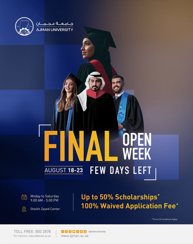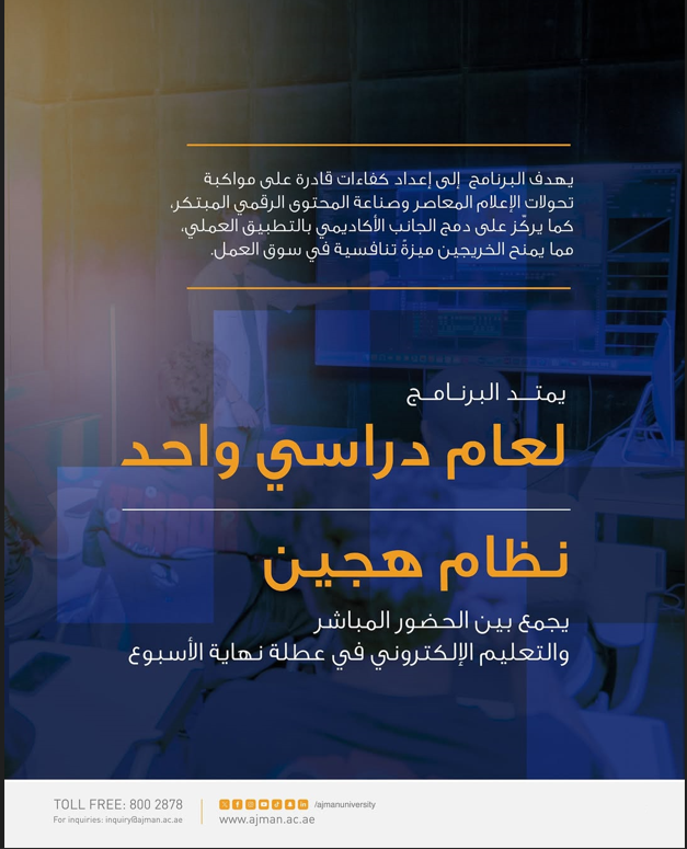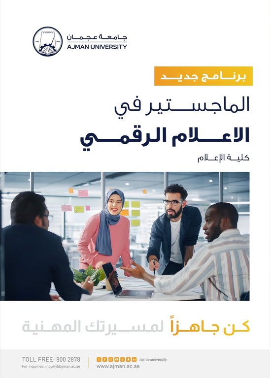 The College of Mass Communication at Ajman University, which has been accredited by ACEJMC and AQAS, launches a Master’s Program in Digital Media. This one-year hybrid program (weekends, in Arabic) is designed to prepare future media leaders to innovate, create, and thrive in today’s fast-changing digital world. Through a blend of academic knowledge and hands-on practice, graduates gain the competitive edge to excel in digital content creation, media innovation, and beyond. Limited seats available — Apply now and take the first step toward shaping the future of media!