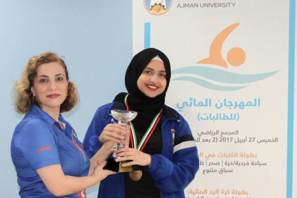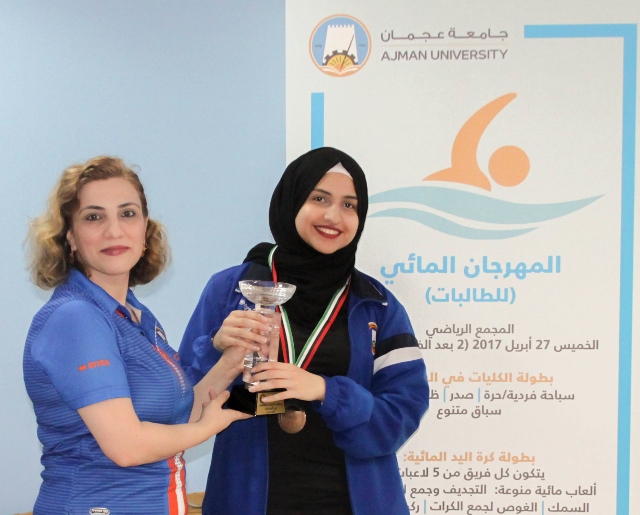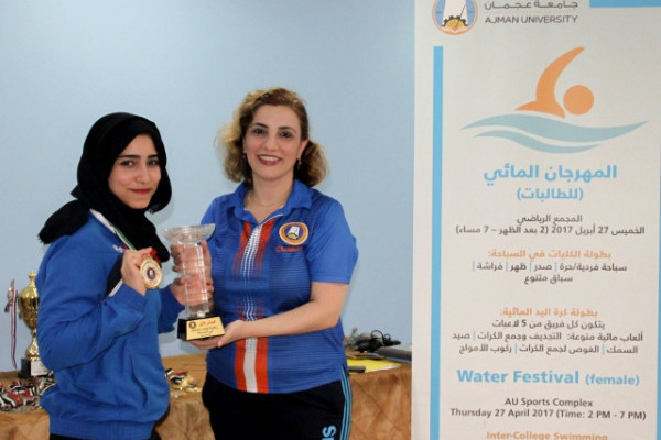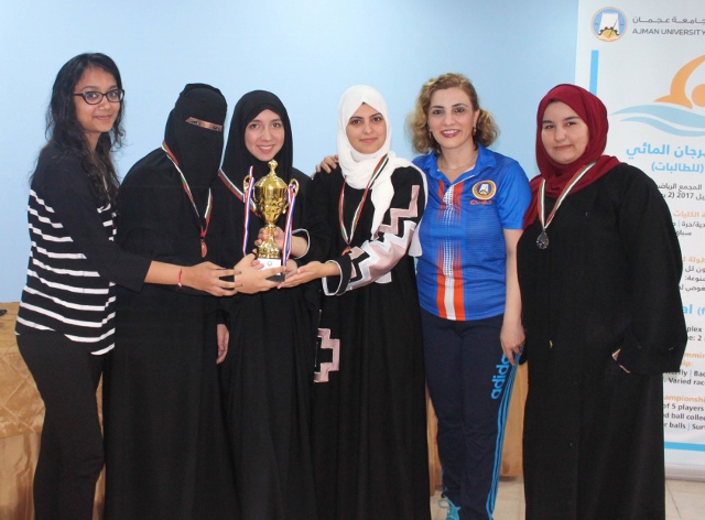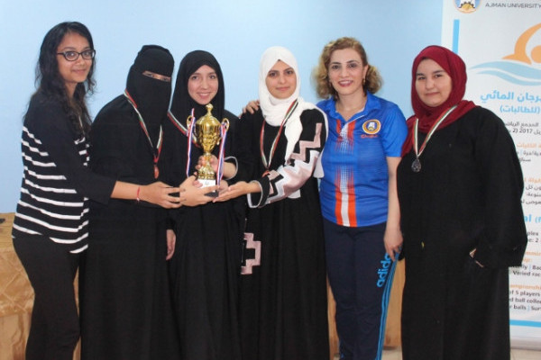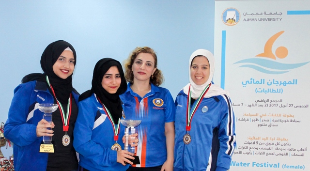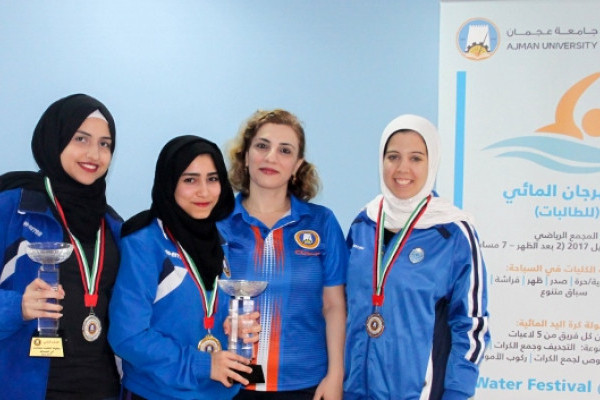 The First Water Festival for female students was organized at Ajman University (AU) by the Deanship of Student Affairs. The event was held at the University Sports Complex and was well attended by the students from the various colleges at AU. The event included water sports, such as swimming, water handball and water games.