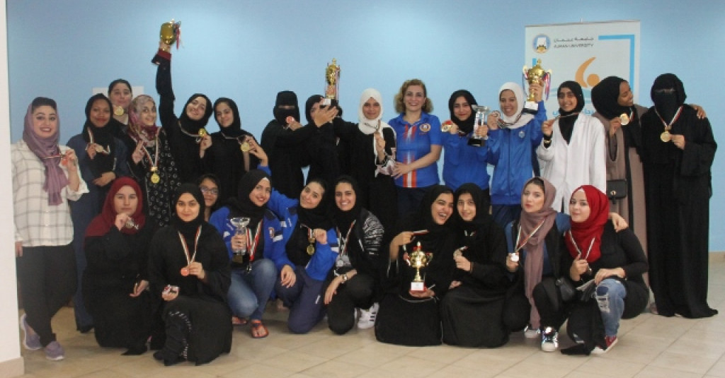 The sports supervisor, Captain Manal Al-Qatlabi, distributed the medals and cups to the female students who won during the competitions during the festival. The students expressed their happiness at participating in this recreational activity, which develops their physical abilities and was a unique way to enjoy on campus with their friends.