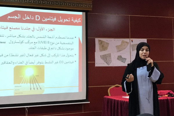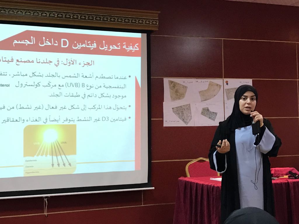 During the lecture, Mrs. Al Amiry explained that the sun is the main source of vitamin D, and that the food provides us with only 20% of our daily requirements. She also described the ideal way to achieve the daily requirements from the vitamin.