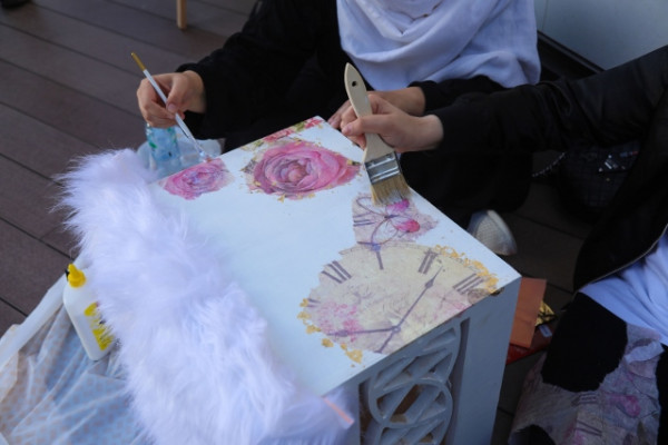 AU students amazed the viewers with their skills and the variety of techniques they utilized to renovate old pieces of furniture. Some of these techniques involved painting on canvas, embroidery work, decoupage, stitching beads, calligraphy and working with wood and metal to create unique pieces of art and give new life to old furniture. It was a wonderful experience and a great challenge to start and finish their projects on site.