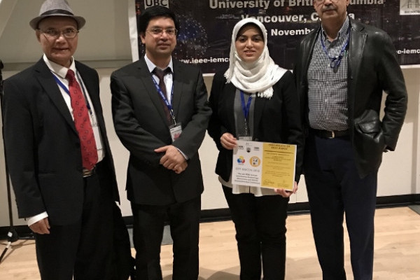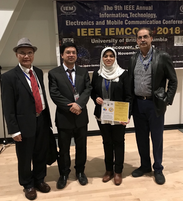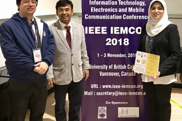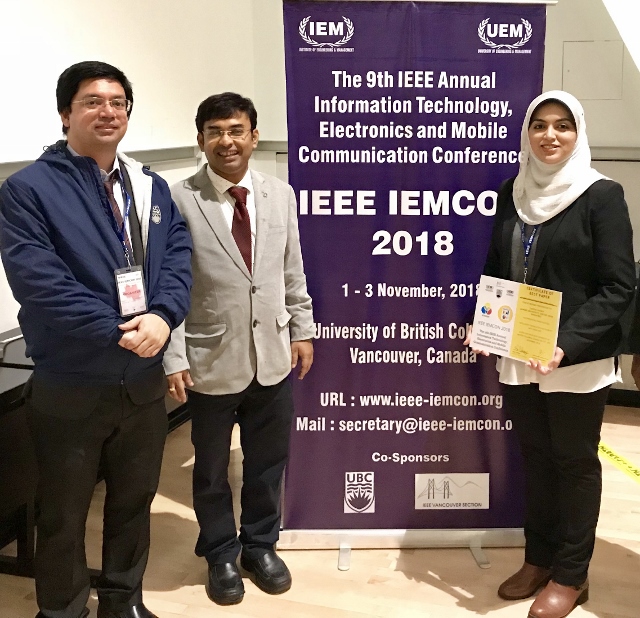 The 9th IEEE Information Technology, Electronics and Mobile Communication (IEMCON) 2018 was held at University of British Columbia, Canada between 1-3 November 2018. Ajman University participated in the annual conference, which aimed to bring together scholars from different disciplinary backgrounds and emphasize dissemination of ongoing research in the fields of Information Technology and Engineering. This year, the conference welcomed over 1000 participants from 28 countries, namely, USA, Canada, Australia, Japan, New Zealand, Germany, France, Ghana, India, Iran, Pakistan, China, Egypt, Peru, Mexico, South Korea, Brazil, United Kingdom, Nigeria, Netherlands, Ukraine, Ecuador, Singapore, Taiwan, Bangladesh, KSA, UAE and Oman.